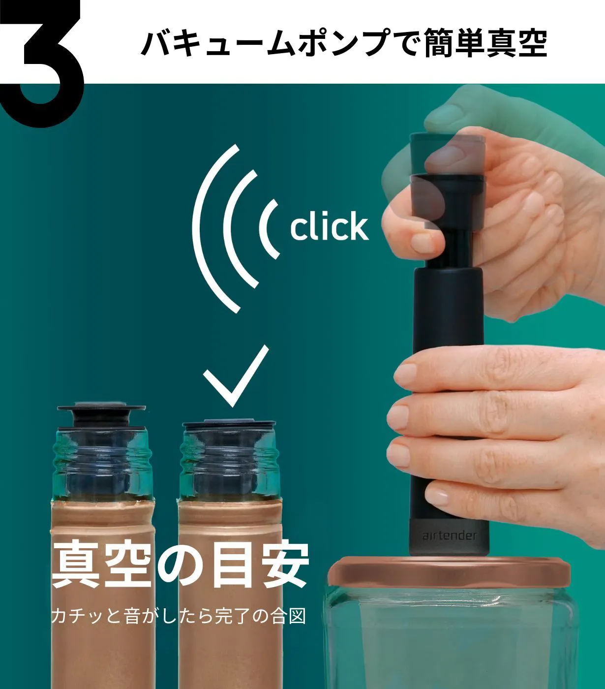 いつか使い道があるはずだ…と、念のために取っておいた空き瓶が自宅に眠っていませんか。エアテンダーの真空ツールセットがあれば、捨てるはずだった瓶が真空容器に生まれ変わります。