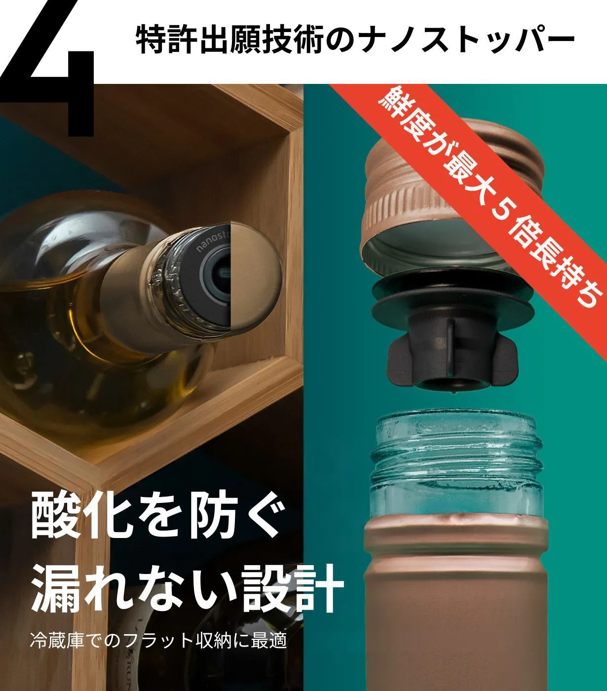 →ナノストッパーはコルク栓でもスクリュー栓でも使えます。とてもコンパクトなので、スクリューキャップの下にも収まります。そのため、安心して開封したボトルを真空状態で水平に保管することができる。