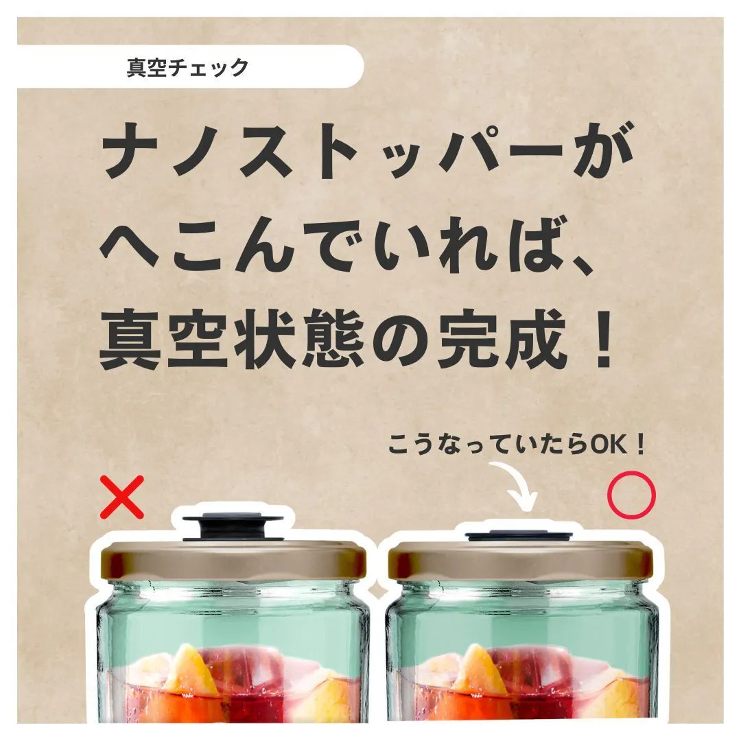 また、高さがある蓋は製品の構造上、穴を開けることができません。日本のスーパーなどで市販されている瓶詰の蓋は使用できるものがほとんどですので、ぜひ色々な瓶で真空保存をお楽しみ下さい。