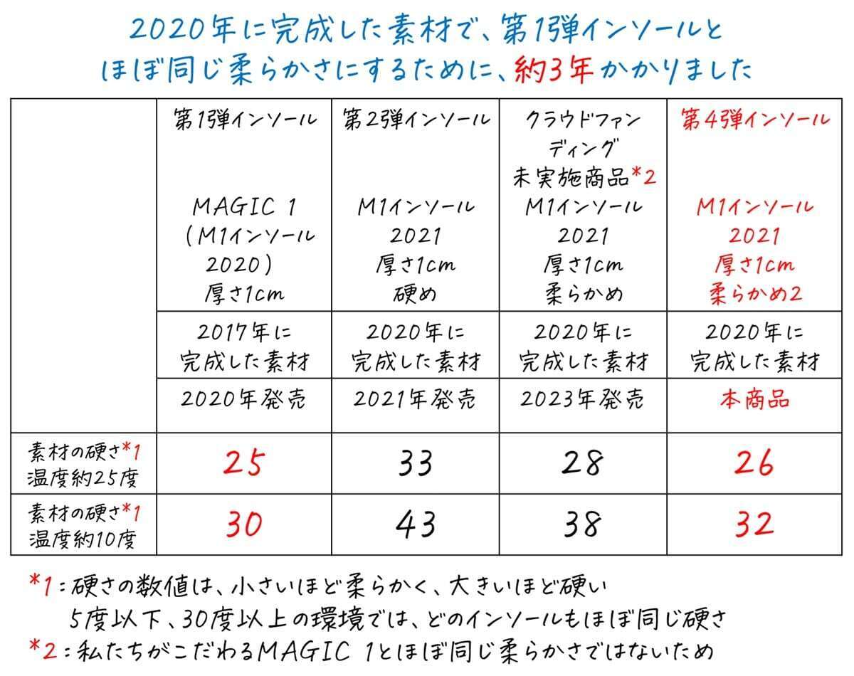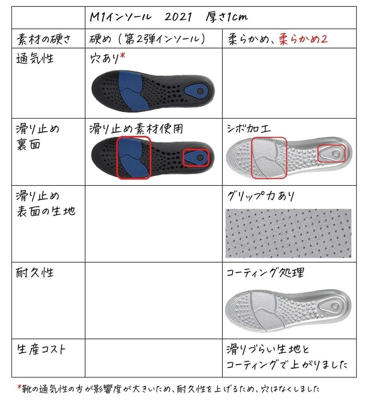生産する時の温度と湿度の影響を受けるため、M1インソール2021 かかとの厚さが1cm(柔らかめ2)を安定して生産することが困難で、今後、生産する商品の柔らかさは努力義務になっております。