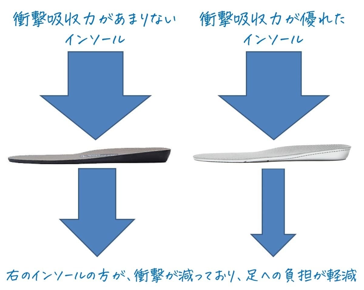 ※インソールは、一般的に厚いほど、衝撃吸収力がアップするため