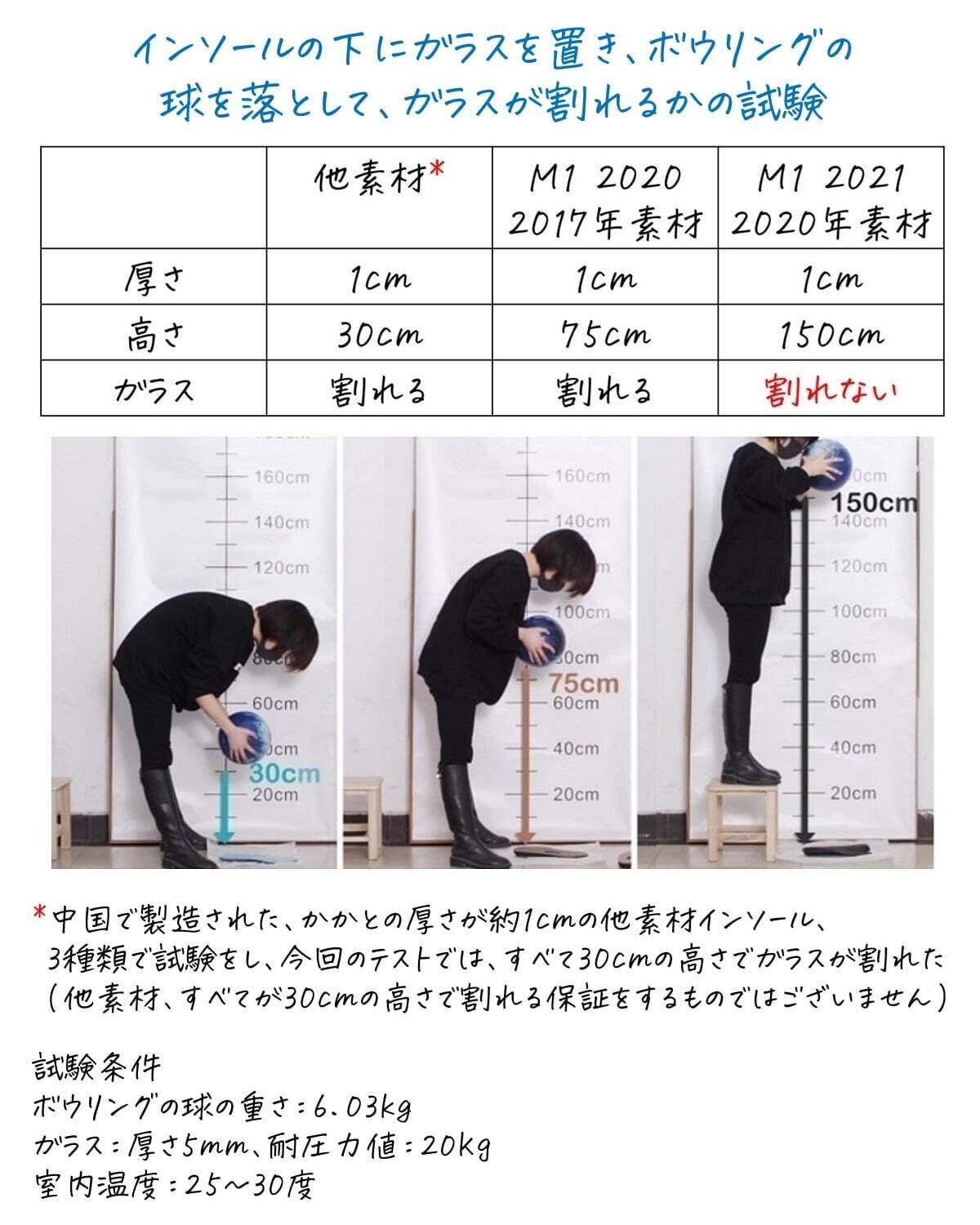 足への負担を減らす解決策の1つが衝撃吸収力の高いインソールで、M1インソールは、独自の素材を開発し、その素材を使うことで、圧倒的な衝撃吸収力を実現しております。