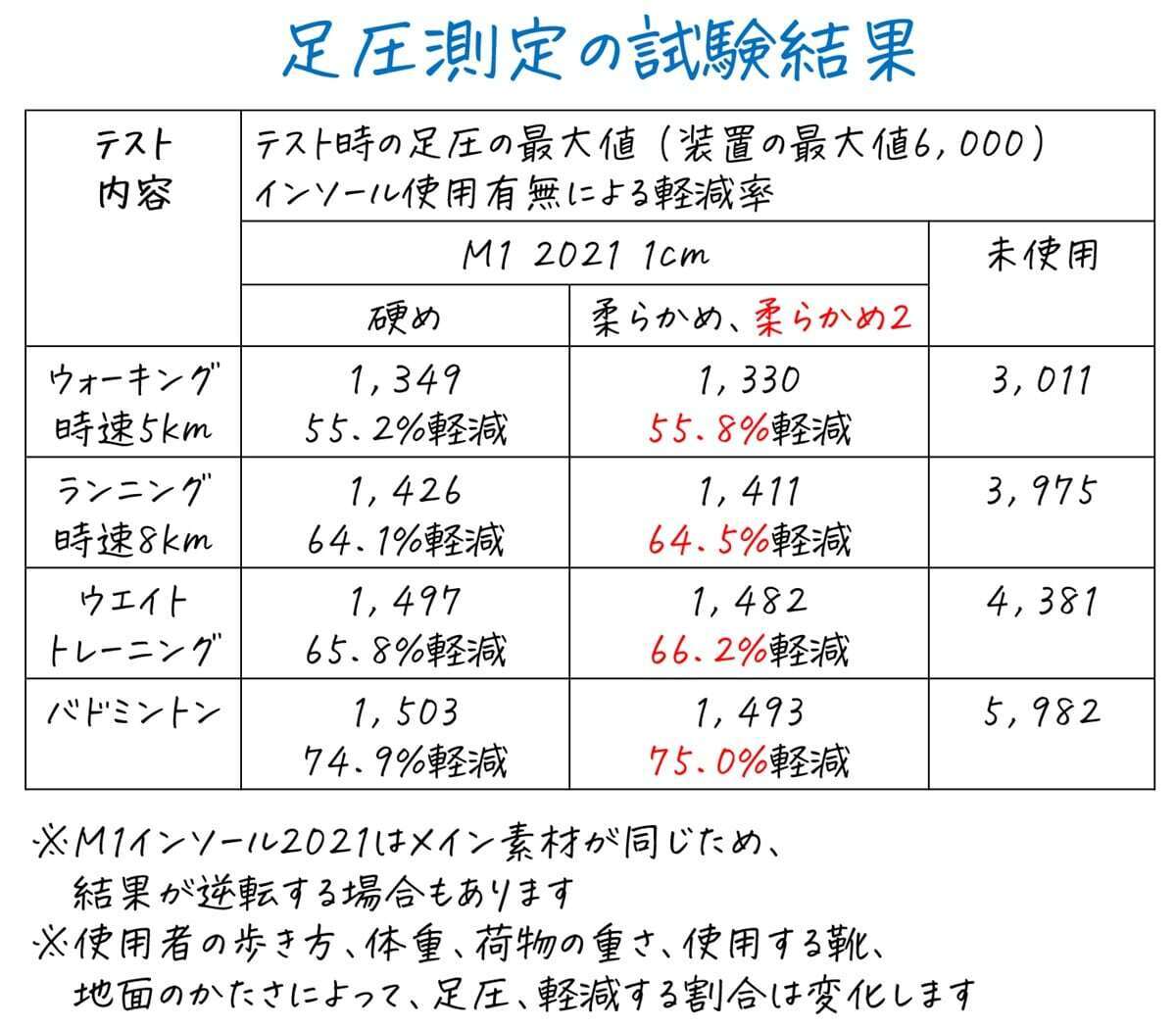 M1インソール2021 かかとの厚さが1cm(柔らかめ2)を使用することで、使用しないときと比べ、足圧の最大値が約55.8~75.0%軽減という試験結果を得ました。