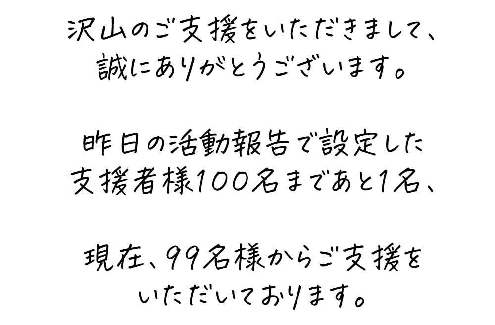 支援者様100名を設定し、数日かけて達成できれば良いと考えておりました。