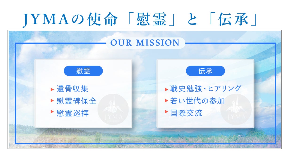 皆さんはじめまして。私たちは創団57年を迎え大学生を中心に、沖縄・硫黄島や海外諸国にて先の大戦で亡くなられた戦没者の遺骨収容活動や慰霊巡拝活動等を行う「特定非営利活動法人JYMA日本青年遺骨収集団」(以下:JYMA)と申します。学生を中心に政府の戦没者遺骨収集活動に参加、協力している日本で唯一の遺骨収集専門のNPO団体であり、全国各地から約50名の学生が集い、皆「戦没者のご遺骨を一日でも早く収容し、ご遺族の元へお還ししたい」という熱い思いで日々、活動に取り組んでおります。