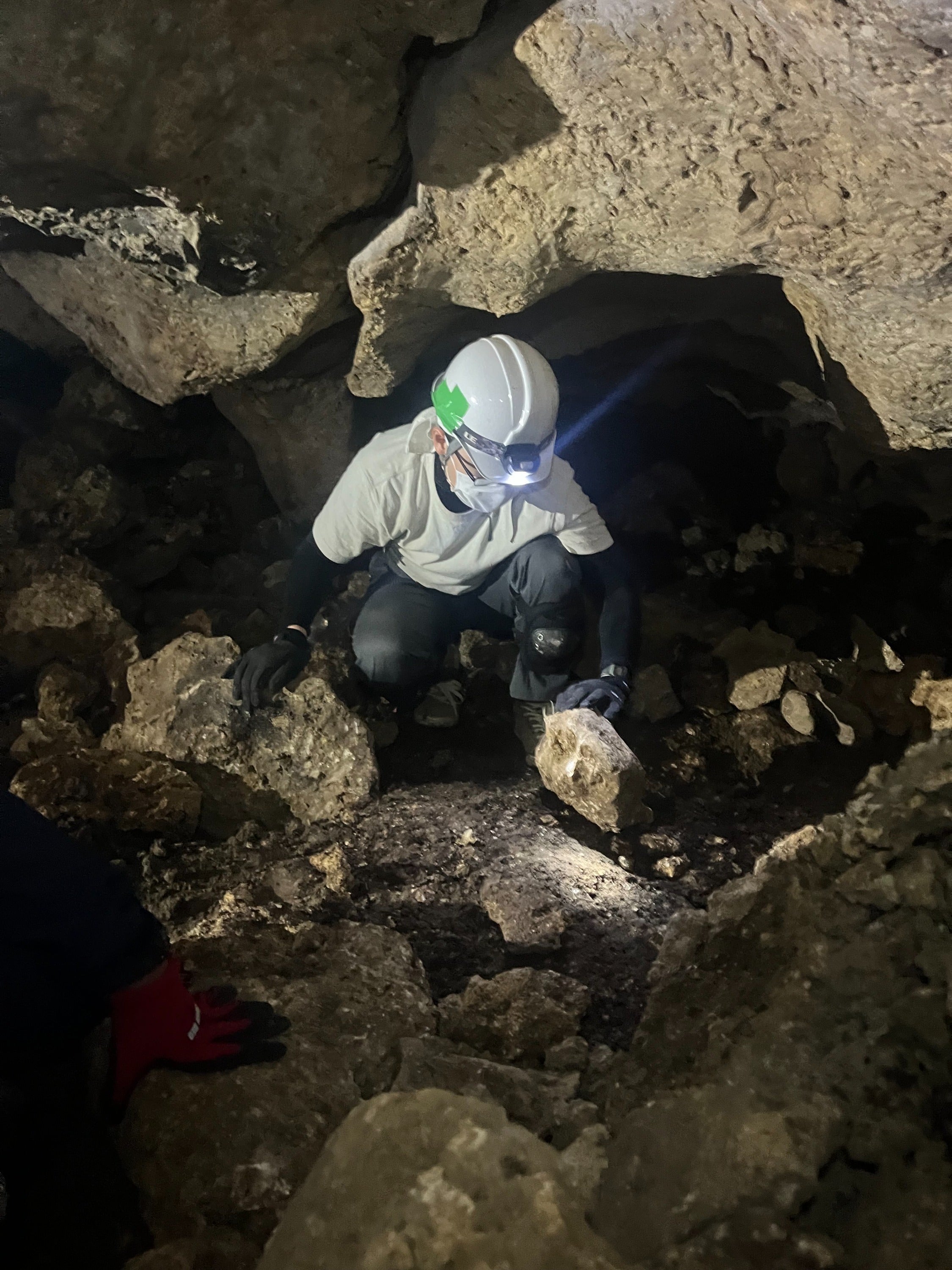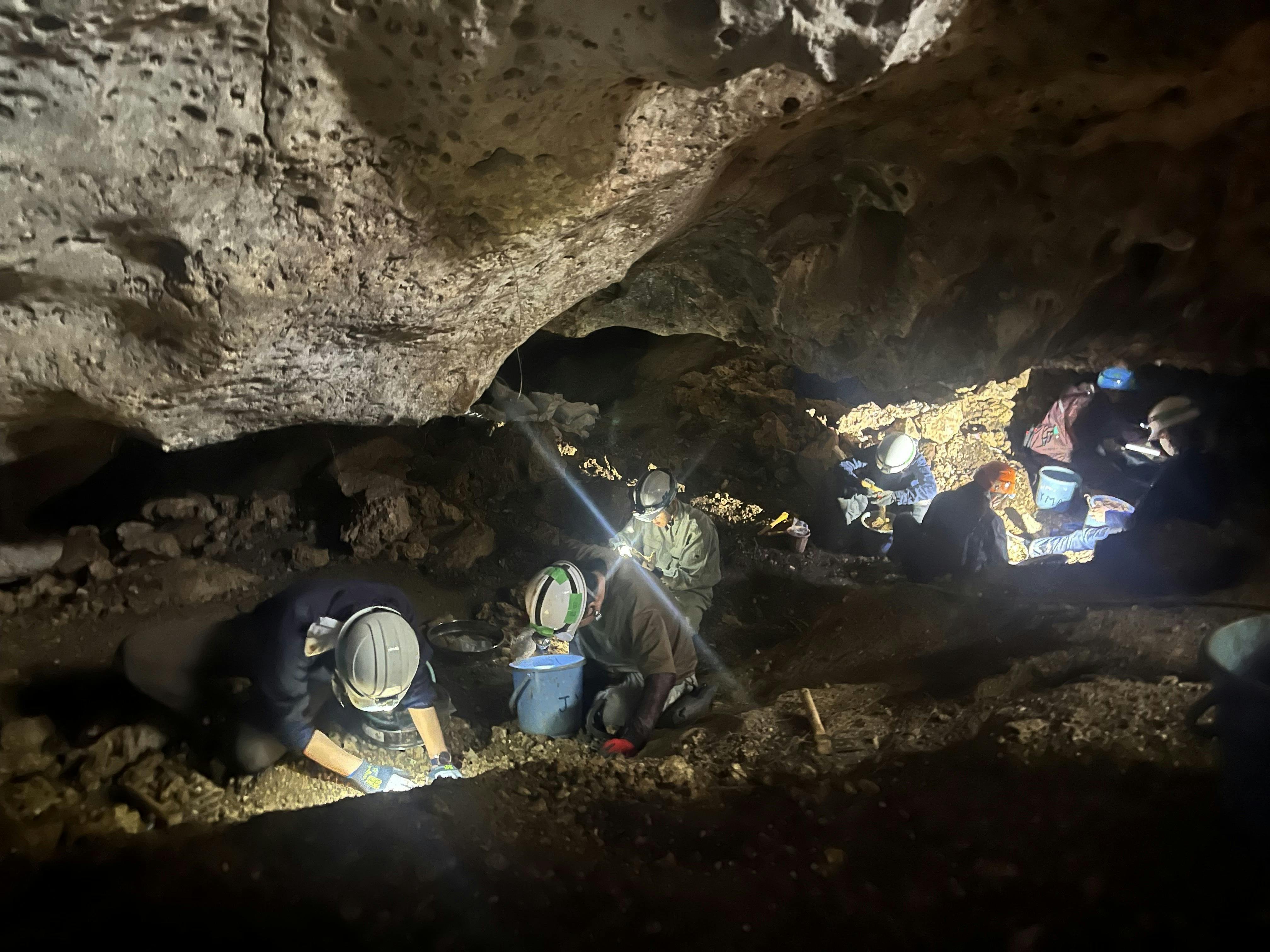 非常に暗いガマの中で懸命にご遺骨を探す学生たち