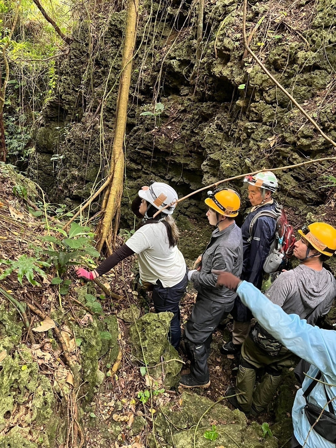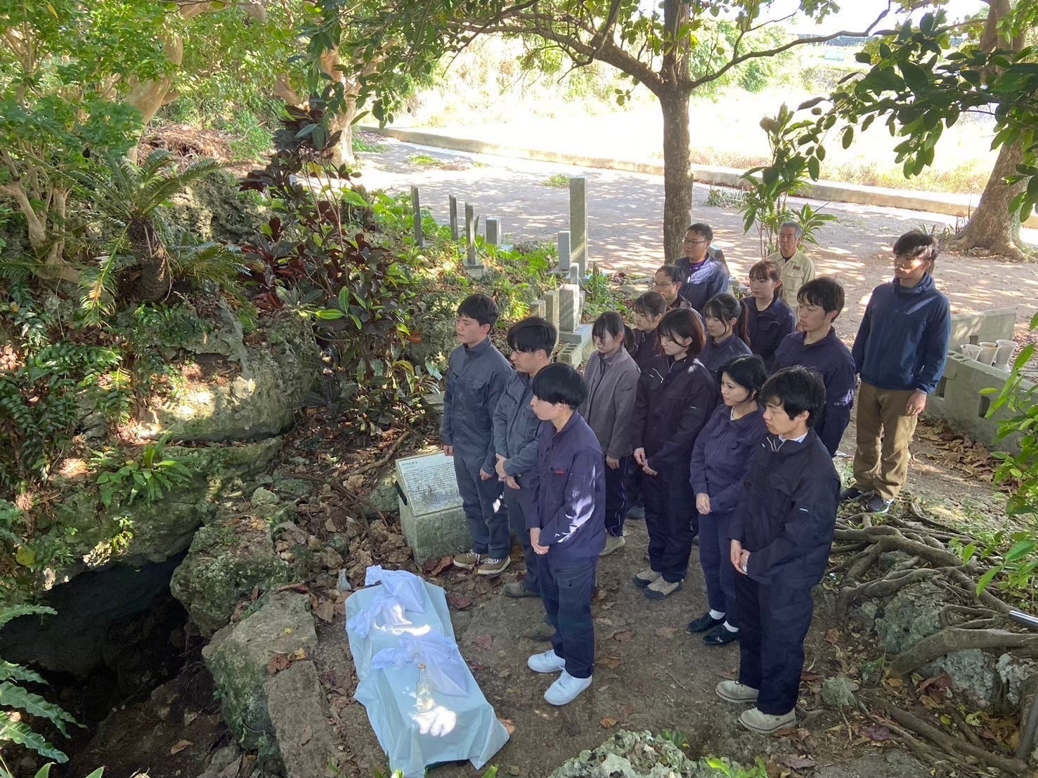 活動地のガマの前で先人への思いを馳せる学生ら