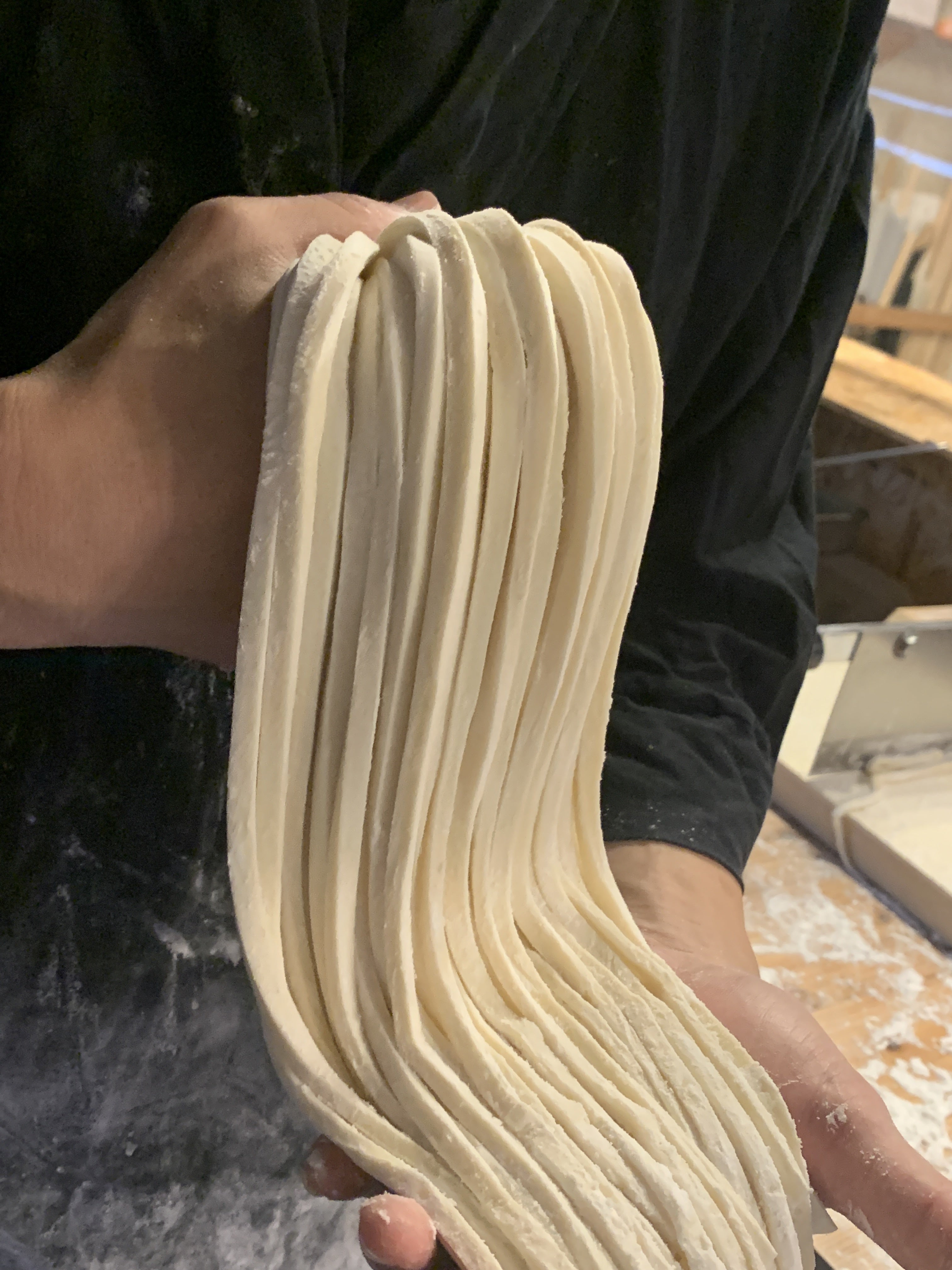 麺の中心部を太く、端を細くする延し方にすることで、食べ応えと啜りやすさを両立し、一口の食感により要素を増やし複雑性を持たせた手打ち独自の食感を味わう麺線に仕上げています。