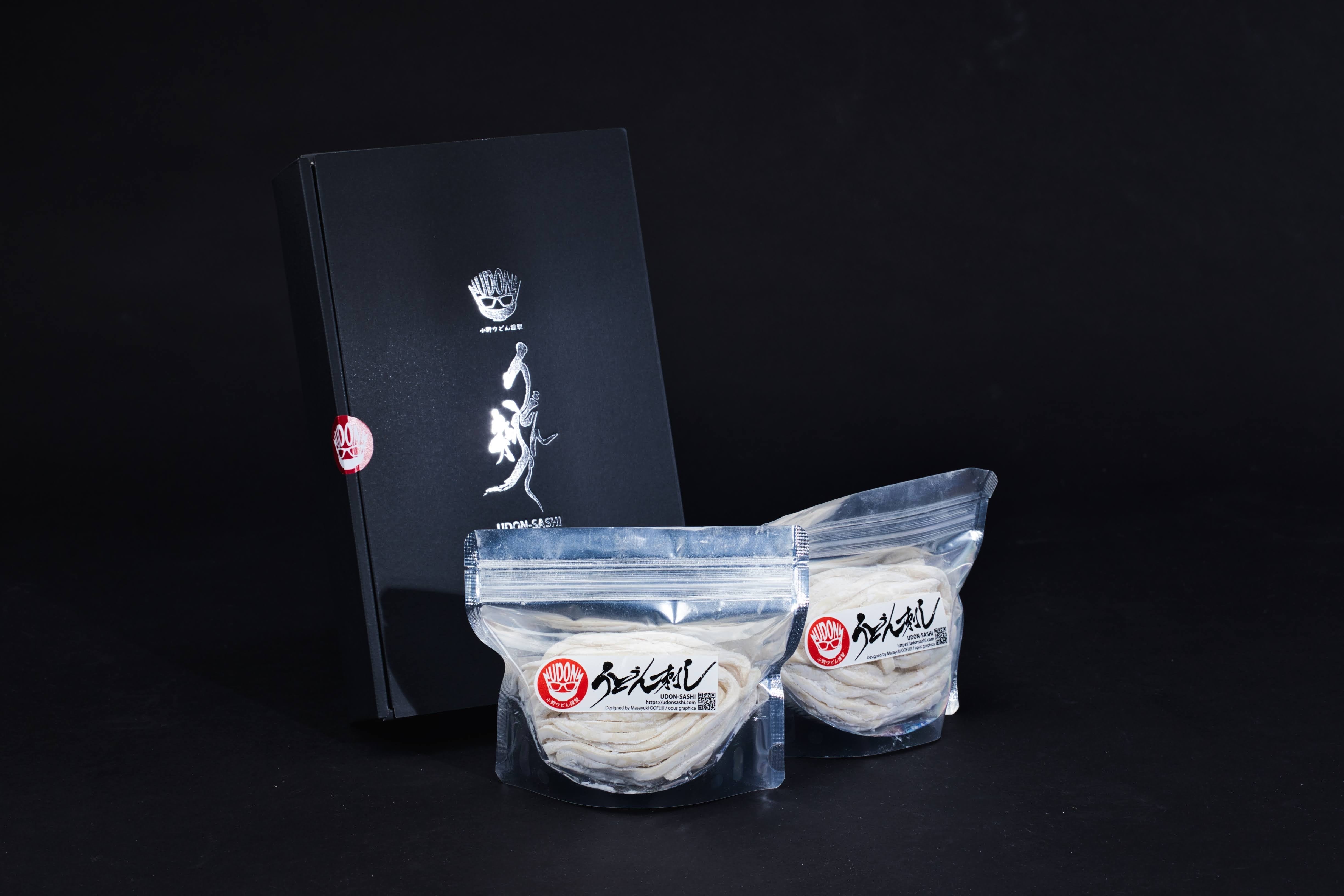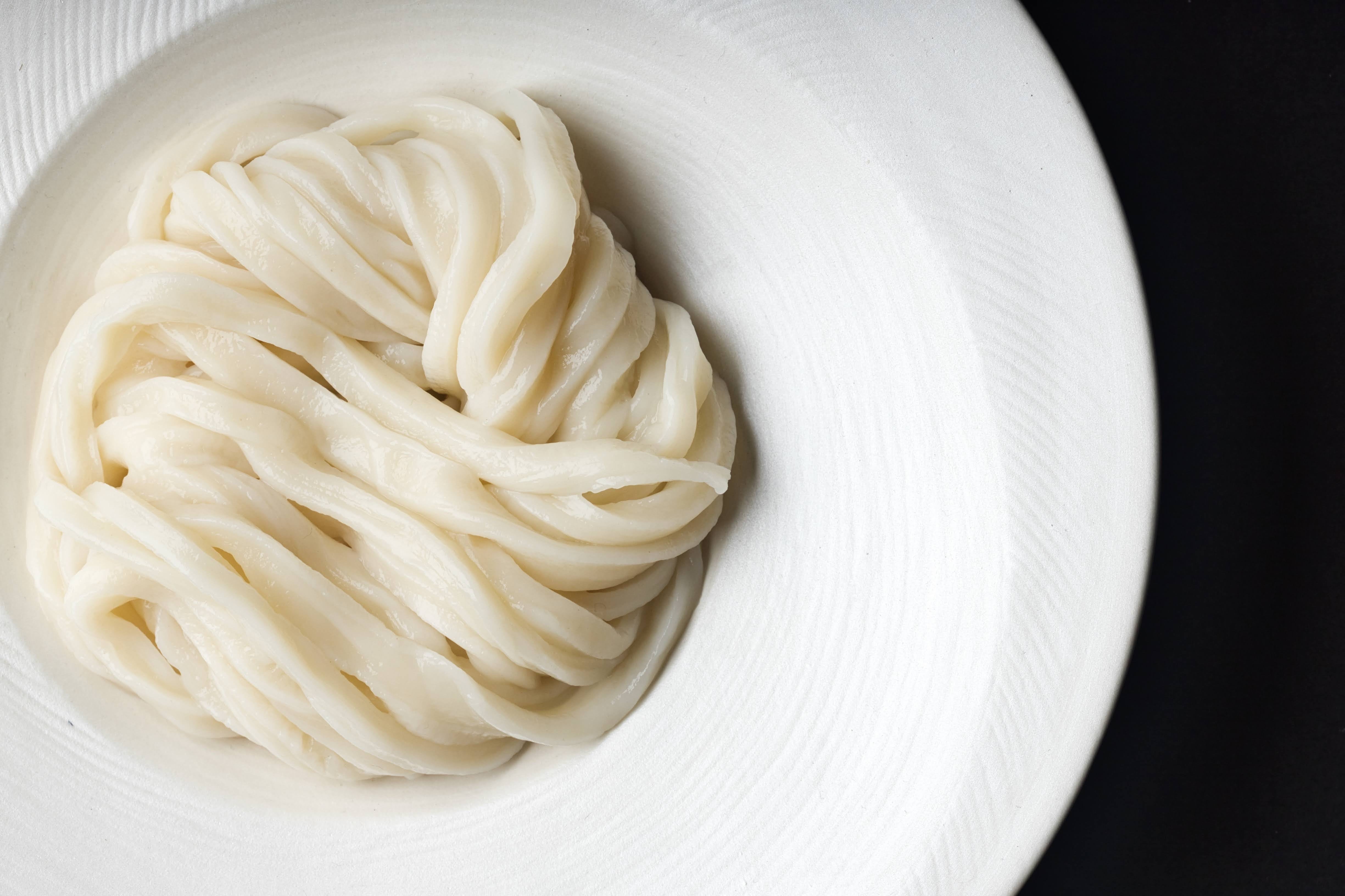 粘弾性の讃岐うどんと口当たり柔らかな博多うどんの間の食感を狙う讃博系という言葉を独自に生み出しました。朝練り多加水&完全国産小麦ブレンド[福島県産きぬあずま、愛知県産きぬあかり、愛媛県産チクゴイズミ]で冷たいうどんに照準を当てた新食感を日々目指しています。