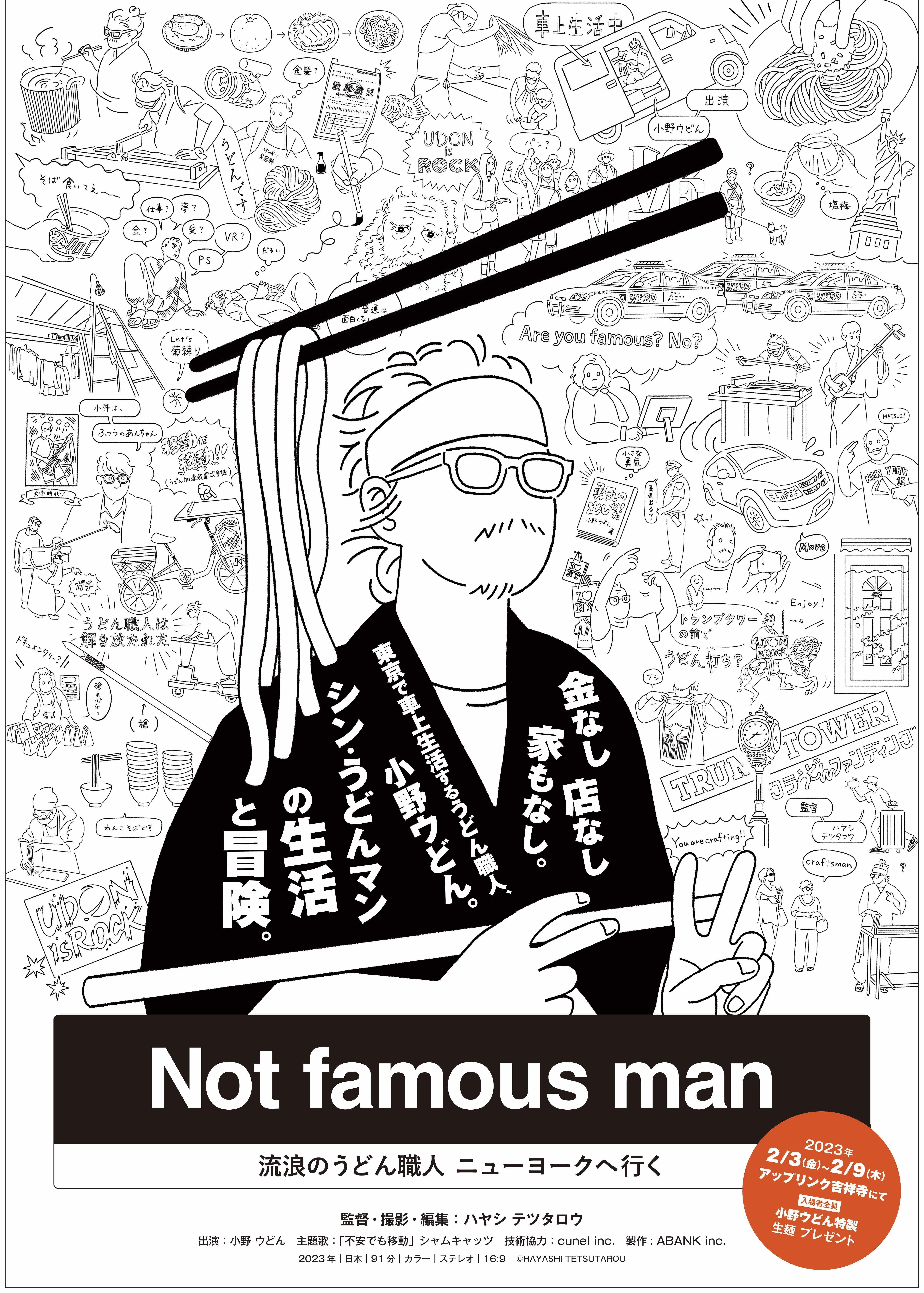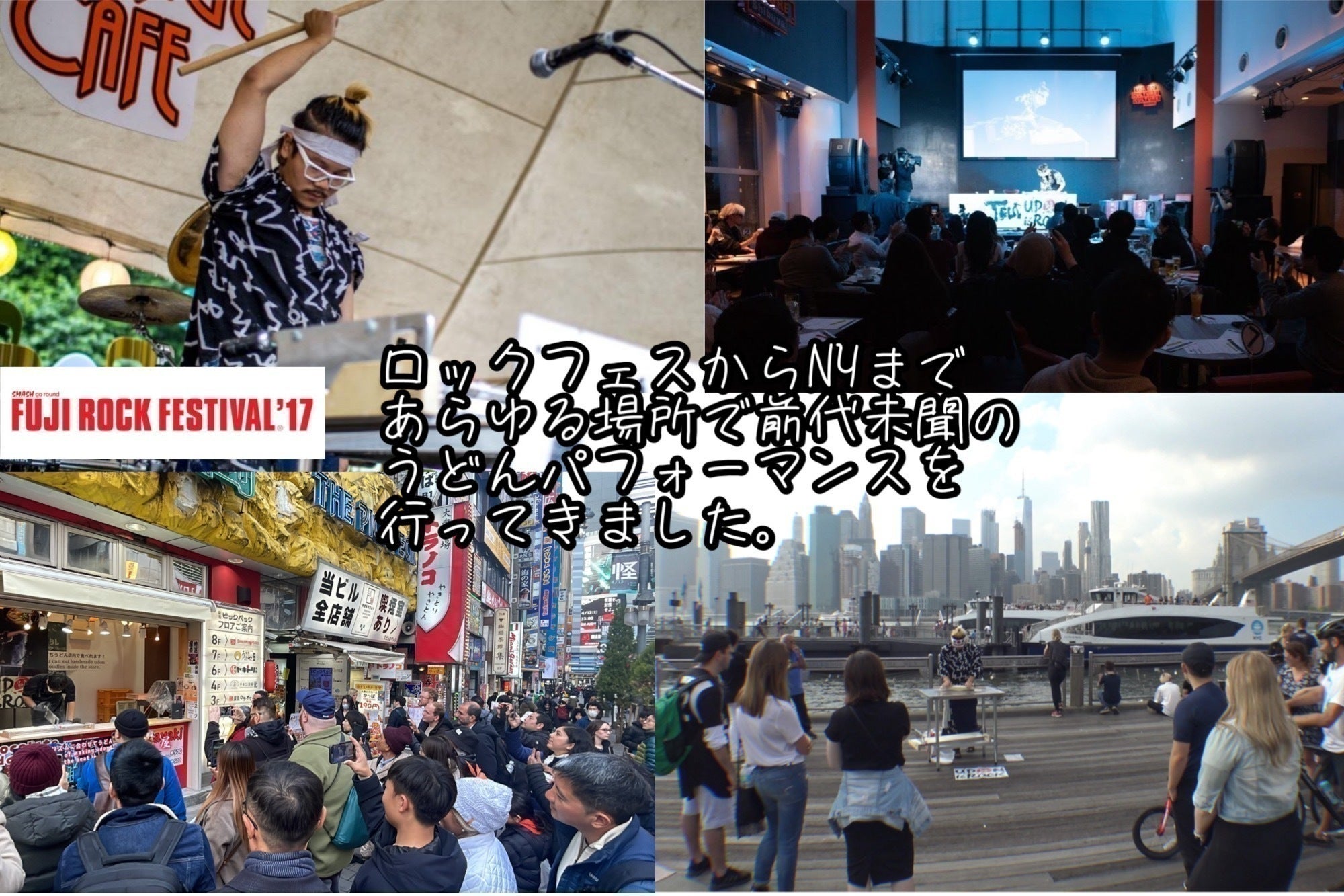 家を捨て車上生活と出張うどん打ち&物々交換をしながら全国を放浪しつつ、NYやフジロックフェスで前代未聞のうどんパフォーマンスを行ったり、その破天荒がドキュメンタリー映画「Not famous man」になったり