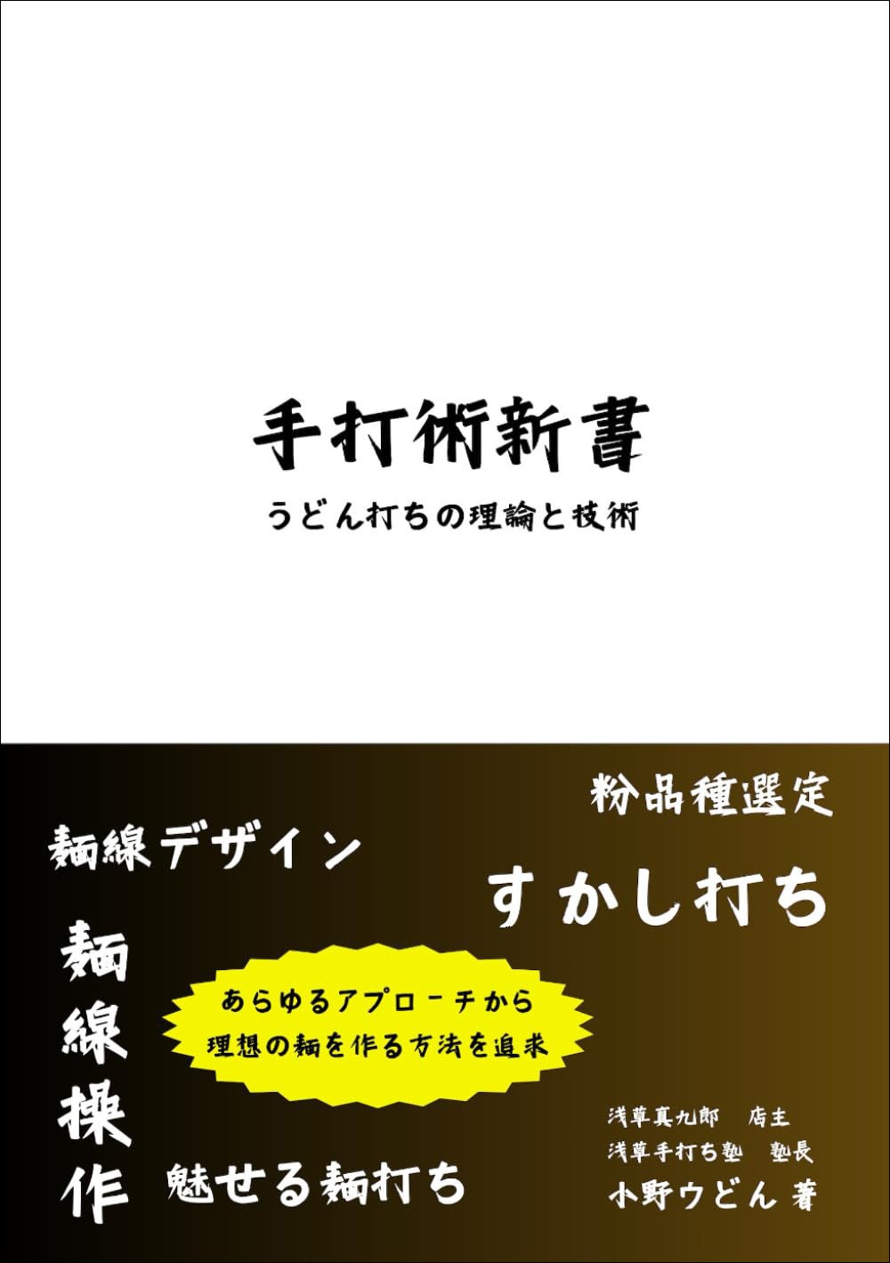 東京新宿の慎、水天宮の谷やで学んだ後、浅草手打ち塾を通して独自の実験と研究をした結果、それをまとめたうどん技術本も自分で作りました。↑手打術新書