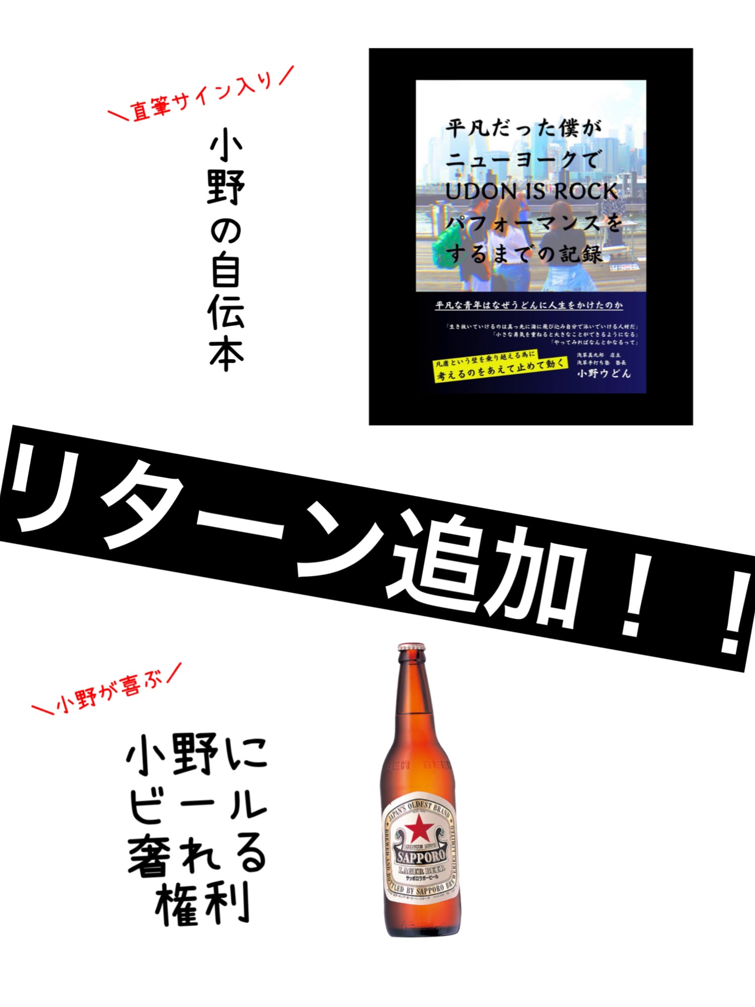 クラウドファンディング開始から皆さんのおかげで支援者160人を突破し、目標金額まであと3%になりました!!あと少しということでここでご支援いただいた皆さんにも是非おかわりいただきたいリターンを2つ追加します!①小野に赤星(ビール)を奢れる権利 5000円うどん回数券に追加で嬉しい(僕が)リターンご用意しました。仕事中と仕事終わりのビールがとにかく美味いんです。そんな僕に瓶ビールを奢れる権利です。うどん回数券に追加で買ってくれると凄く嬉しい!②小野のサイン入り自伝本 7500円昨年シレッとAmazon Kindleで発売した小野20代の頃を書き記した「平凡だった僕がNYでUDON IS ROCKパフォーマンスをするまでの記録」に直筆サインをしてお届けします。人生の色々なエッセンスが詰まってるとか詰まってないとか。是非是非追加のご支援、よろしくお願いします!!