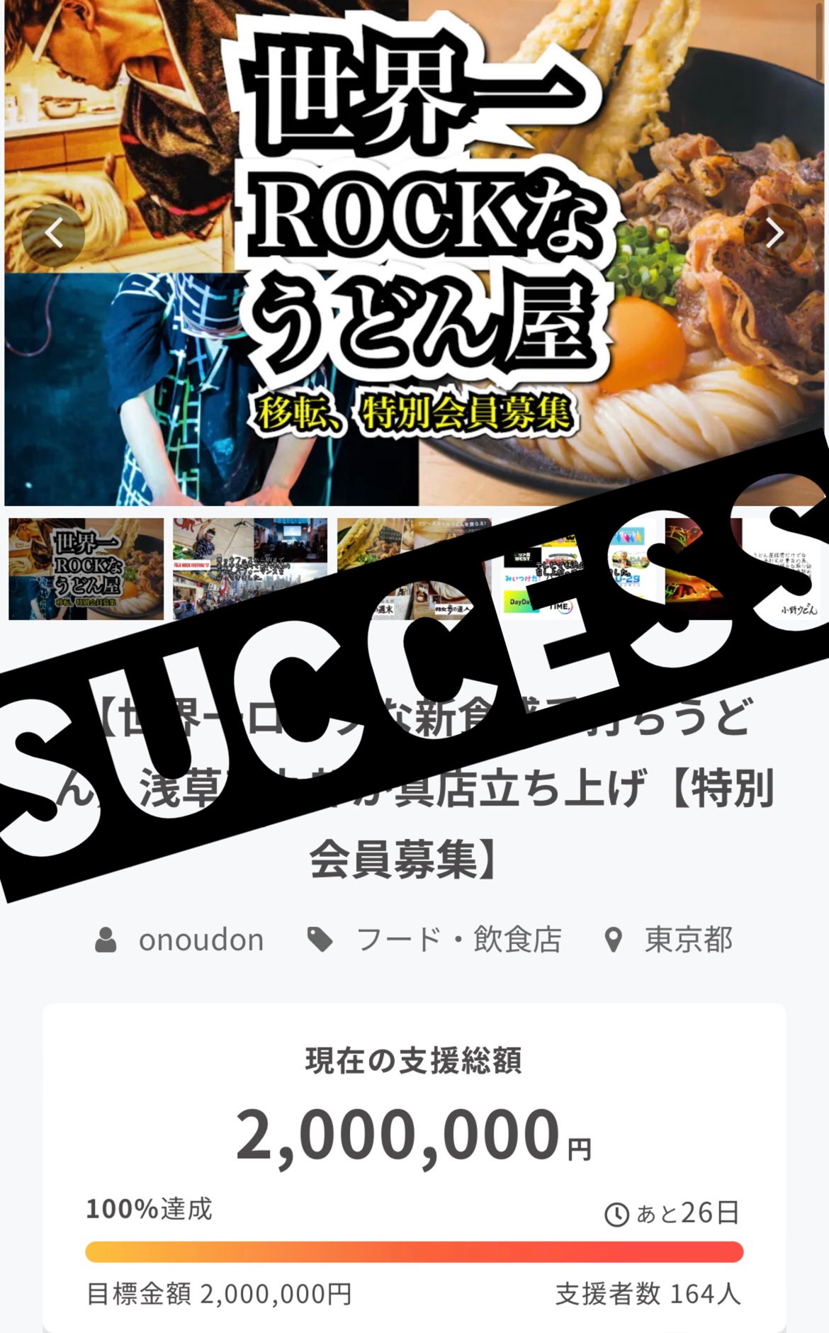 success!!ご支援ありがとうございました!!皆さんのおかげで1週間で目標金額を達成することができました。過去3回クラファンをやっきた中で、今回は桁が違う目標で、人に対して何かをやってきた記憶もない僕に果たしてこんなにも支援してくれる人はいるだろうか、、でも最低でもこれだけは集められないとお店はできないし、でも浅草は無くなるのが決まってて、、始める前はかなり不安で、ネットワークビジネス始めたばりに久しぶりな人にメッセージを送りまくりました。それでも初日集まらなかったらヤバい、、どうしようと、、ようやく少しホッとできた気がします。でもこの200万から手数料を引かれるのもあり、まだまだ足りません。そもそも飲食店を始めるのにこの数字はかなり低いというのはわかる方にはわかると思います。そう、まだ足りないんです。いわゆる真のゴールというのが150%である300万です。次はここを目指して再び走り始めます。ジリ貧な内装とはおさらばして、さらに過ごしやすいロックで快適なお店を目指して。今日追加した2リターンだけでなく、さらなるリターンも考えているので、最後までチラ見してお付き合いいただけると嬉しいです。