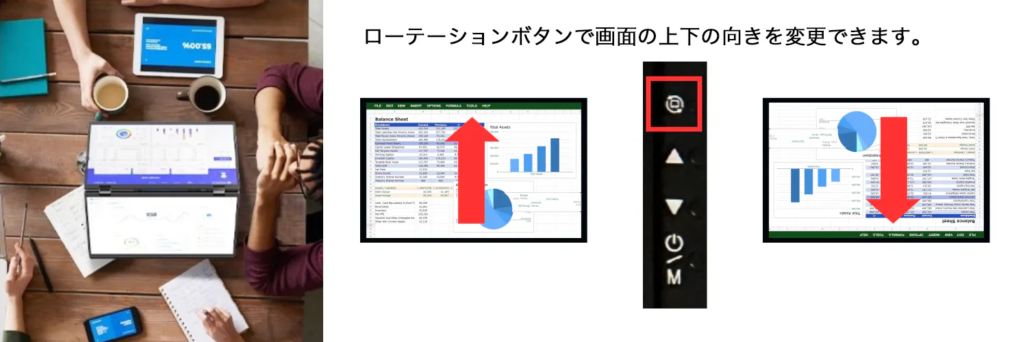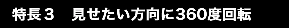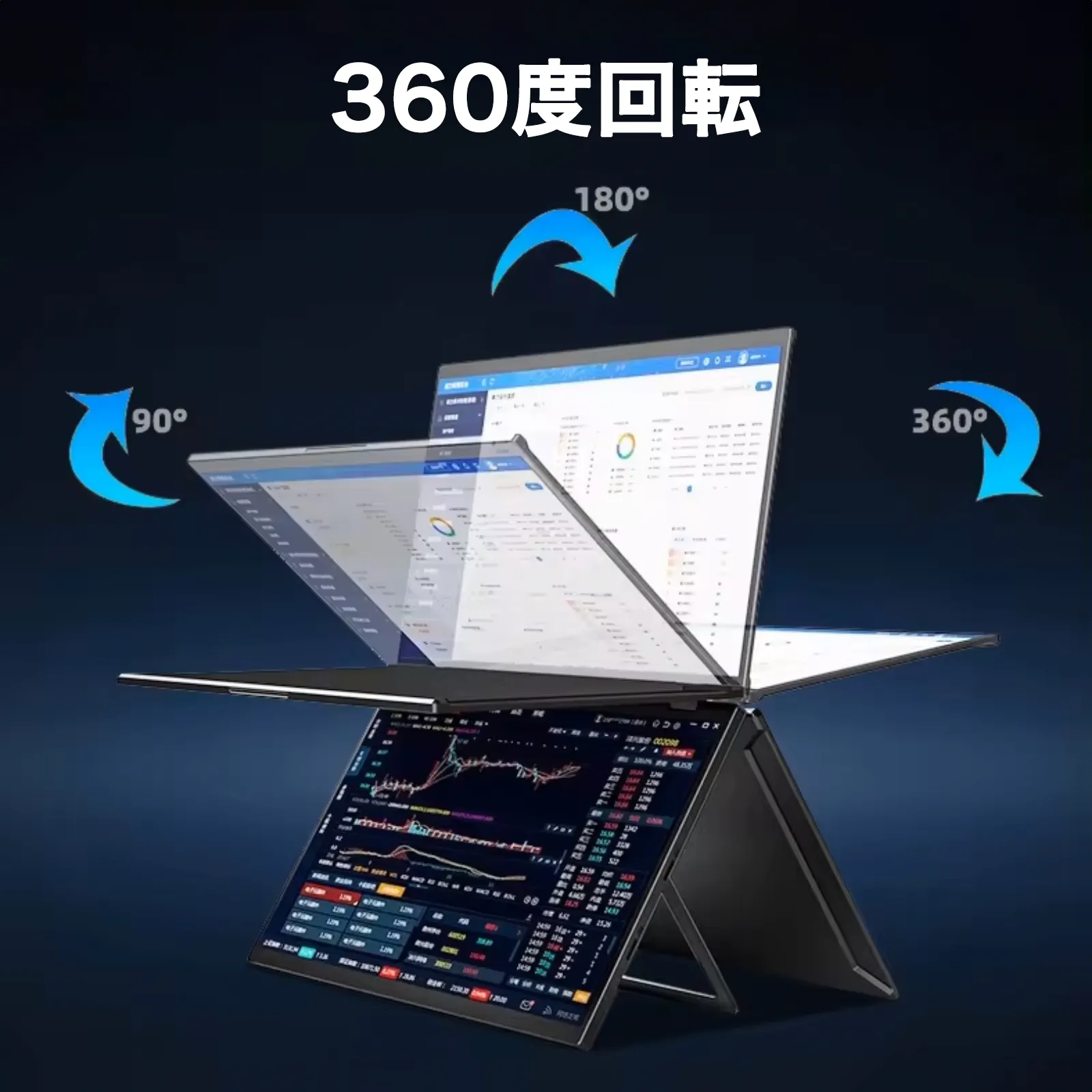 2画面モニターの折り目部分が360度に回転しますので、画面を対面の方に見せたい時や、正面向かいで各々がセカンドモニターとして使用する時に自由に角度調整ができるため大変便利な機能です。