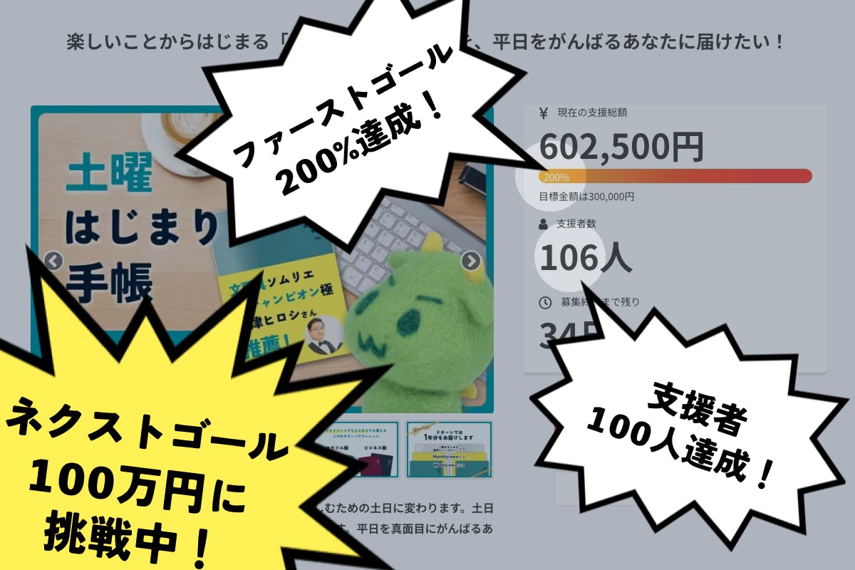 開始24時間で100%達成した時に、ネクストゴール100万円を掲げました。あのときはバタバタしていて、使い道についてご説明しそびれておりました。土曜はじまり手帳の制作やクラウドファンディングに関する費用の一部に当てさせていただきます。具体的にお伝えできる範囲でざっくり書くと、以下のような内訳になっております。