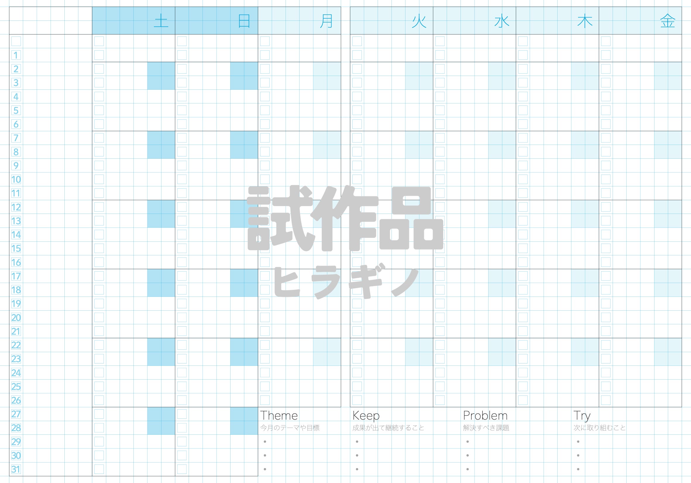 平日を薄いカラーにするのか、グレーにするのか、とても迷いました。月間ページは薄いカラーにして、週間ページはグレーにすることで落ち着きそう。