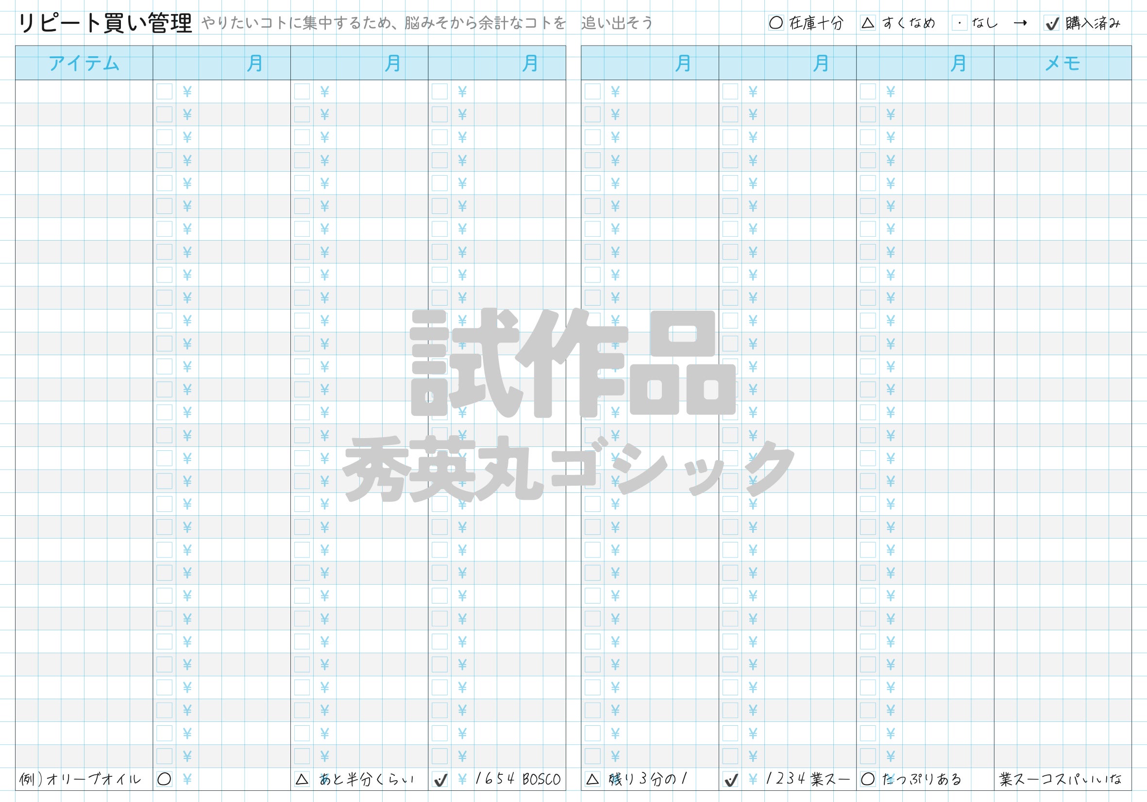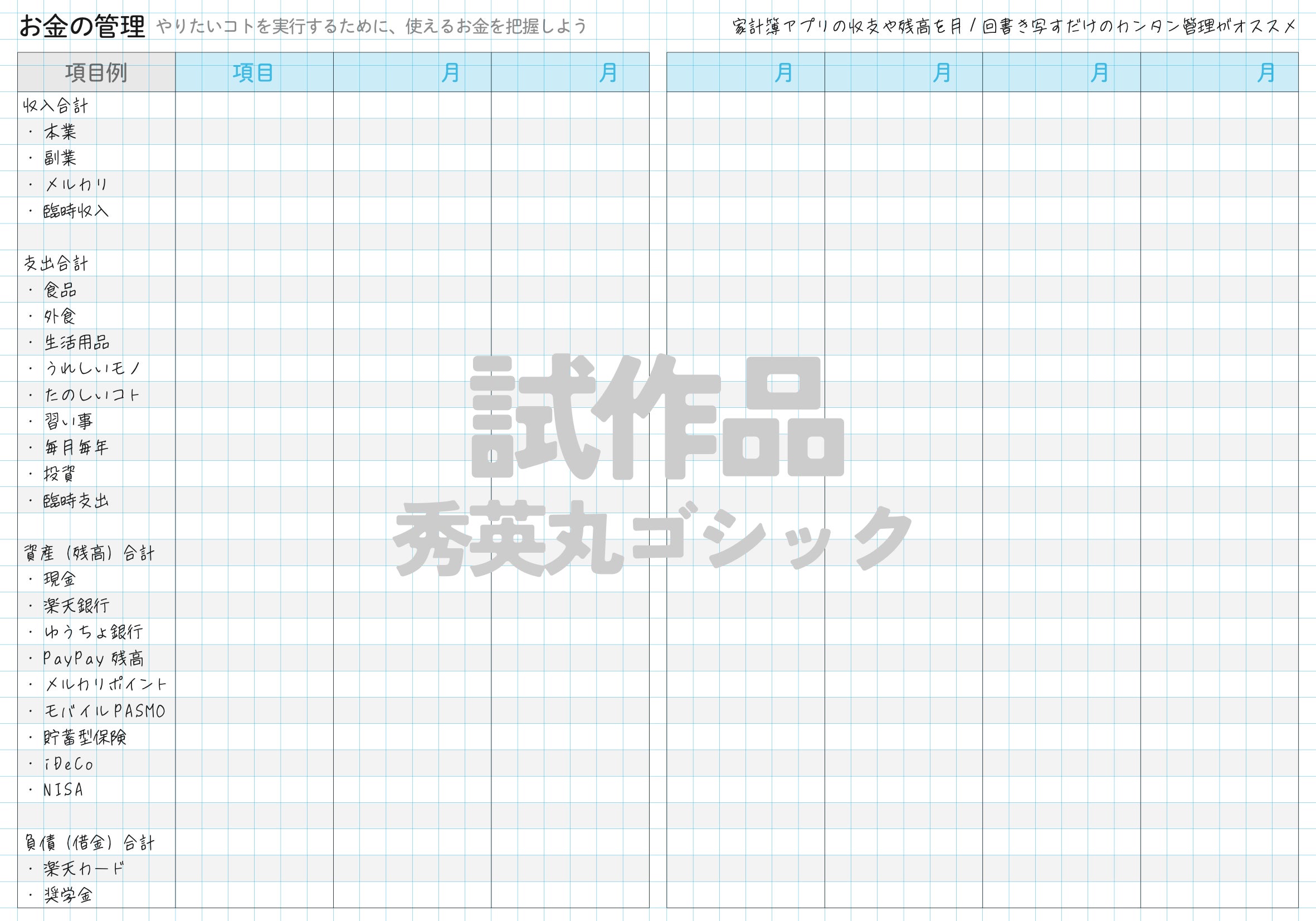 家計簿の項目って、ご家庭によって全然違うんですよね。項目を指定されると途端に使いにくくなるし、かといって完全自由でも書きはじめにくい。項目例を見せるやり方は、我ながらいい感じですわ。