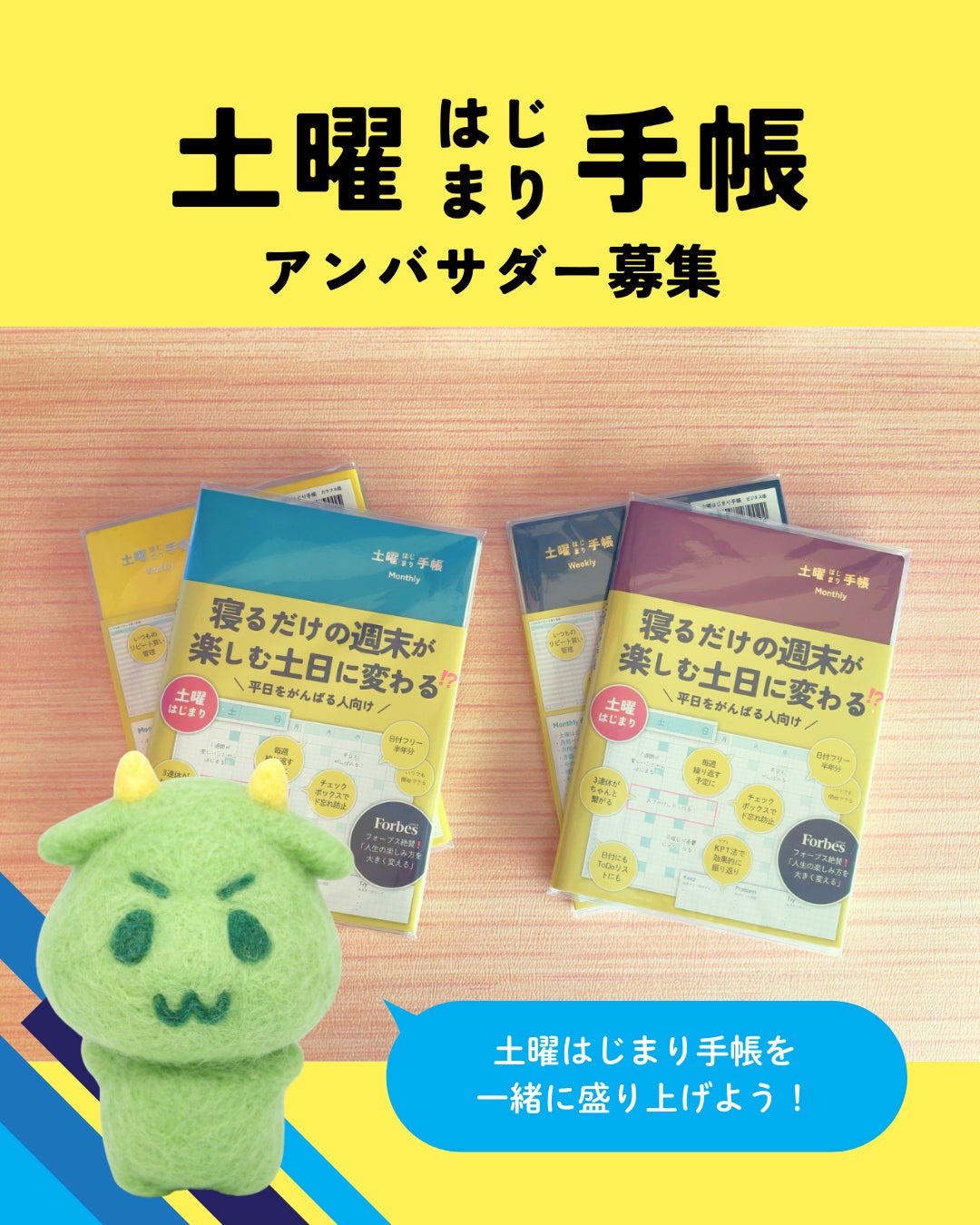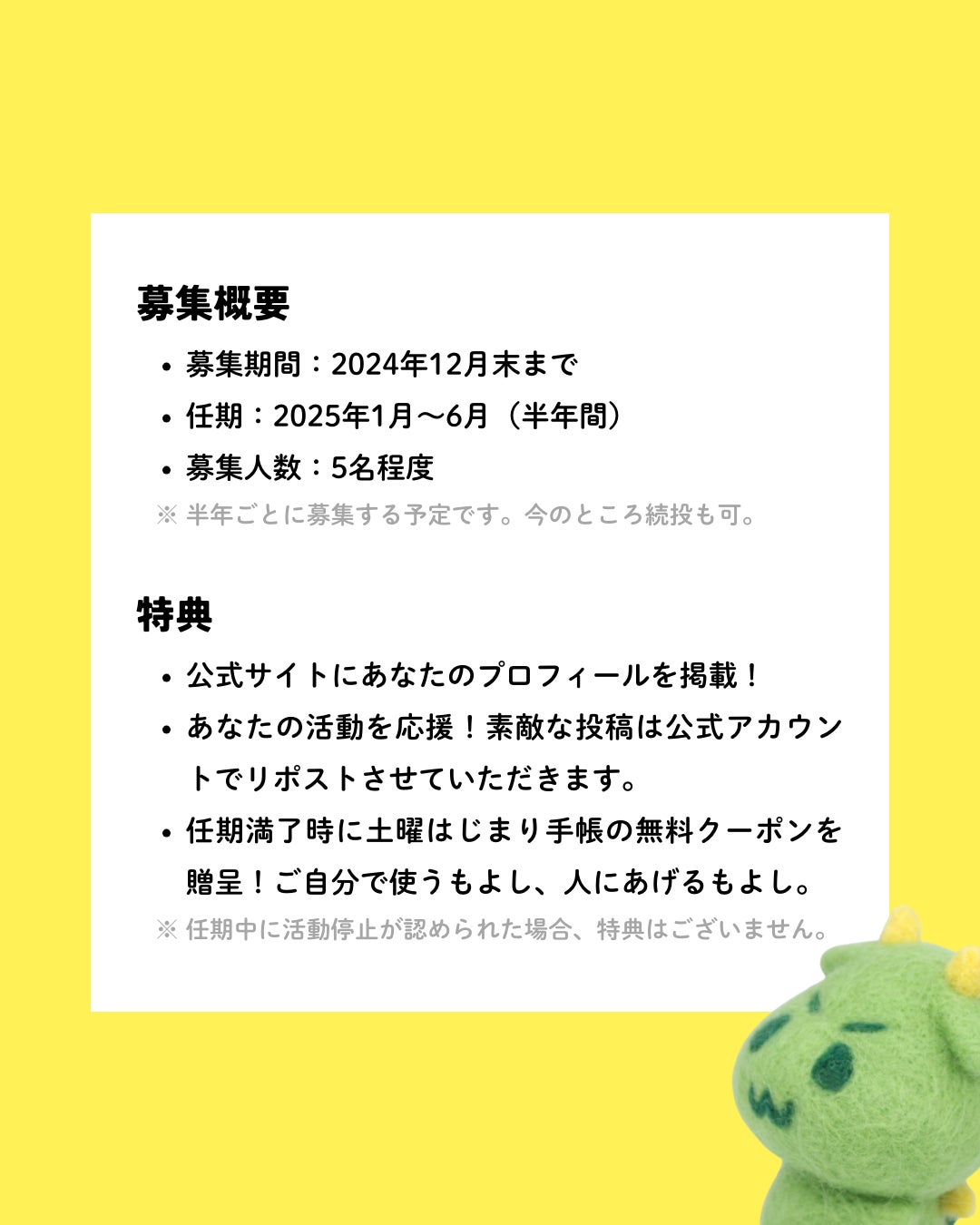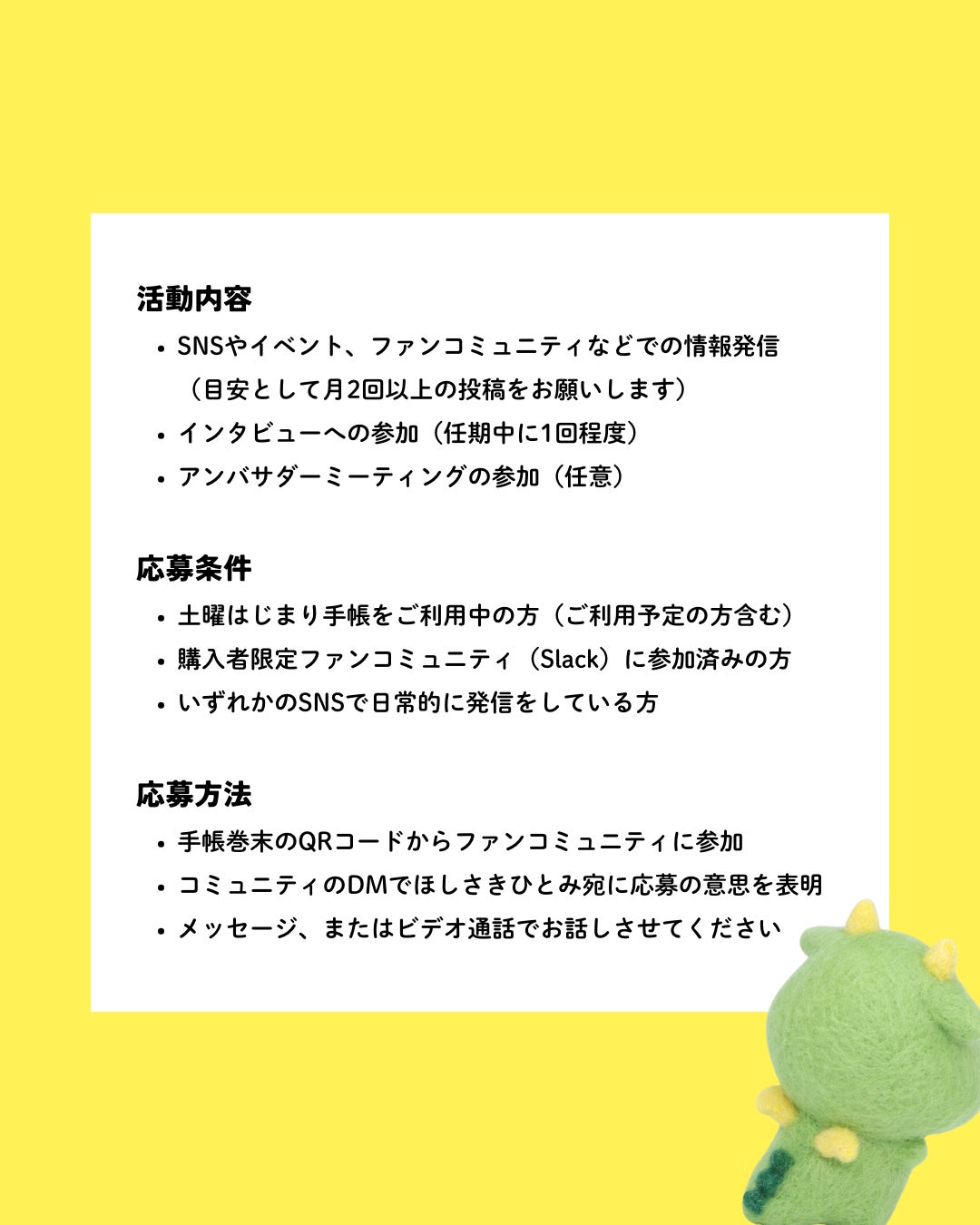 実際に愛用していただける方と一緒に、土曜はじまり手帳を盛り上げていきたいと考えています。そのため、応募条件はちょっとハードル高めかもしれません。まずは私とお話ししましょう♪
