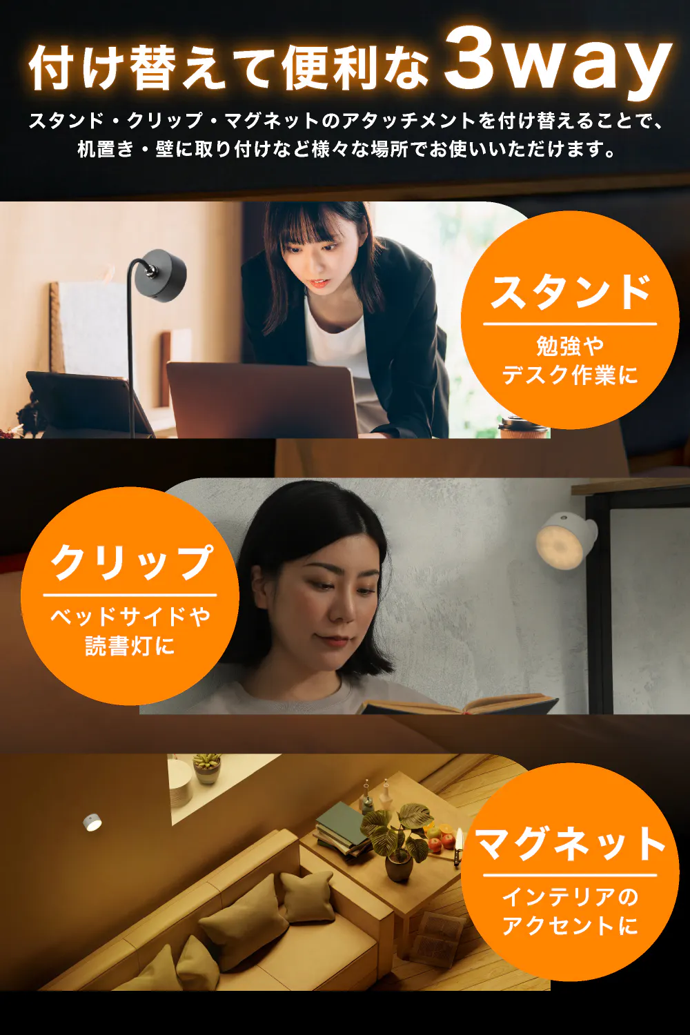 →3つのタイプを取り替えて使用できる、家中どこでも照らせるライト!