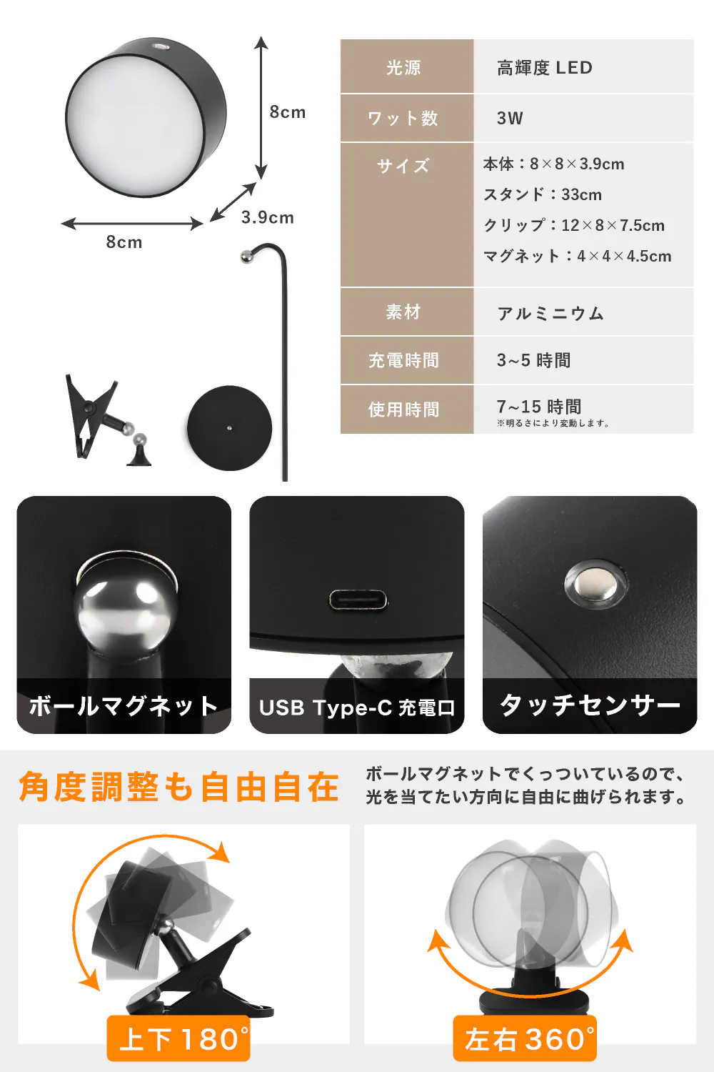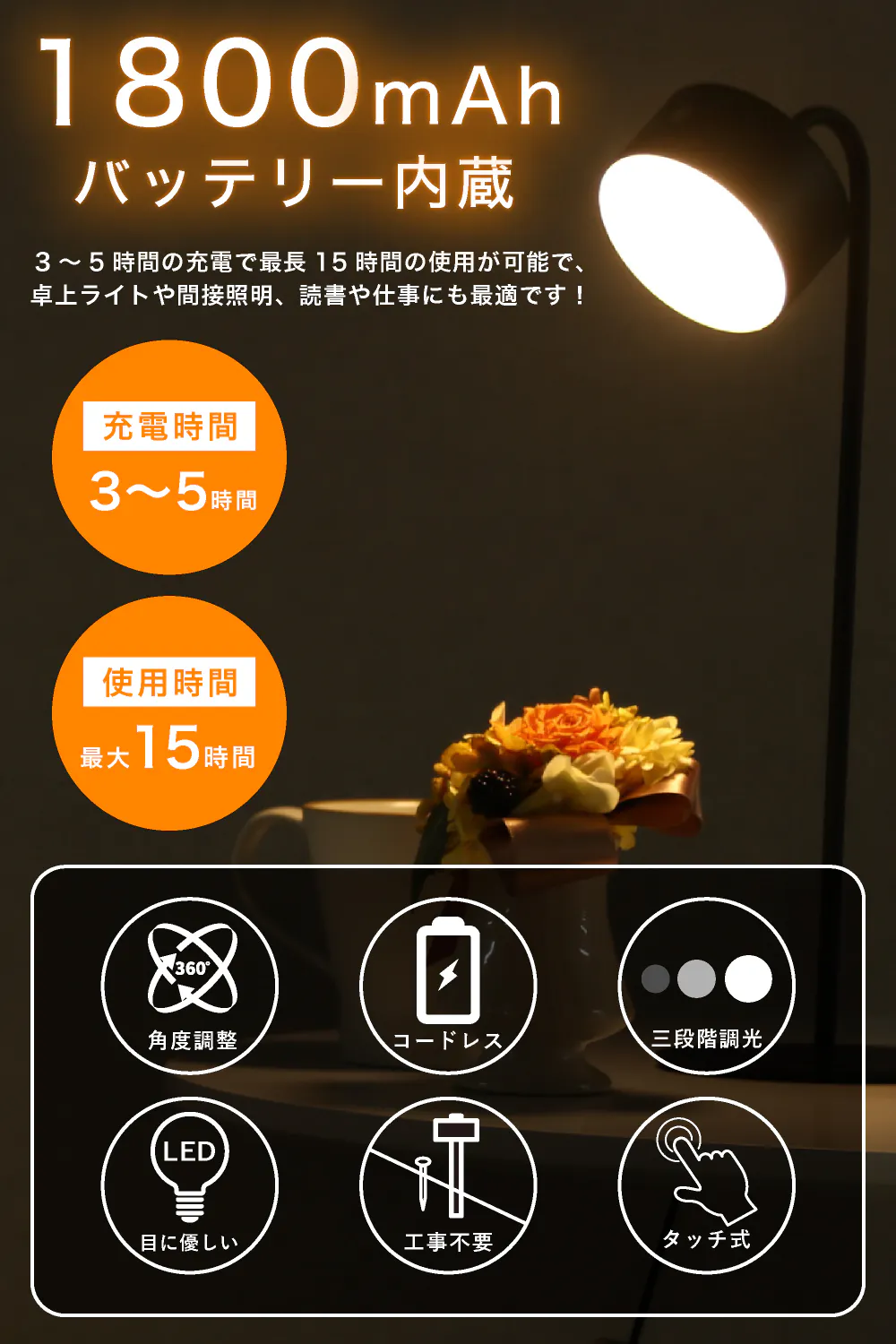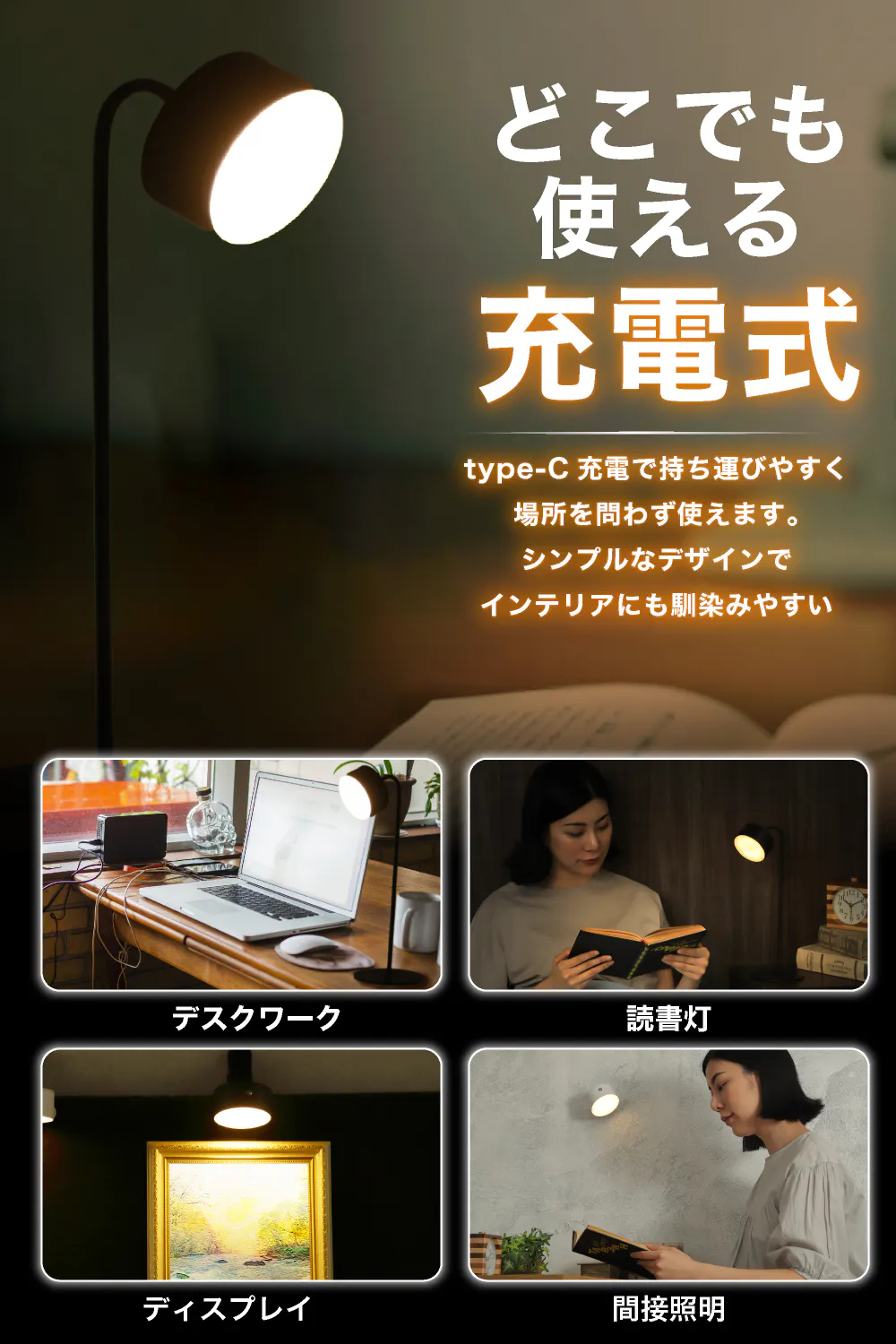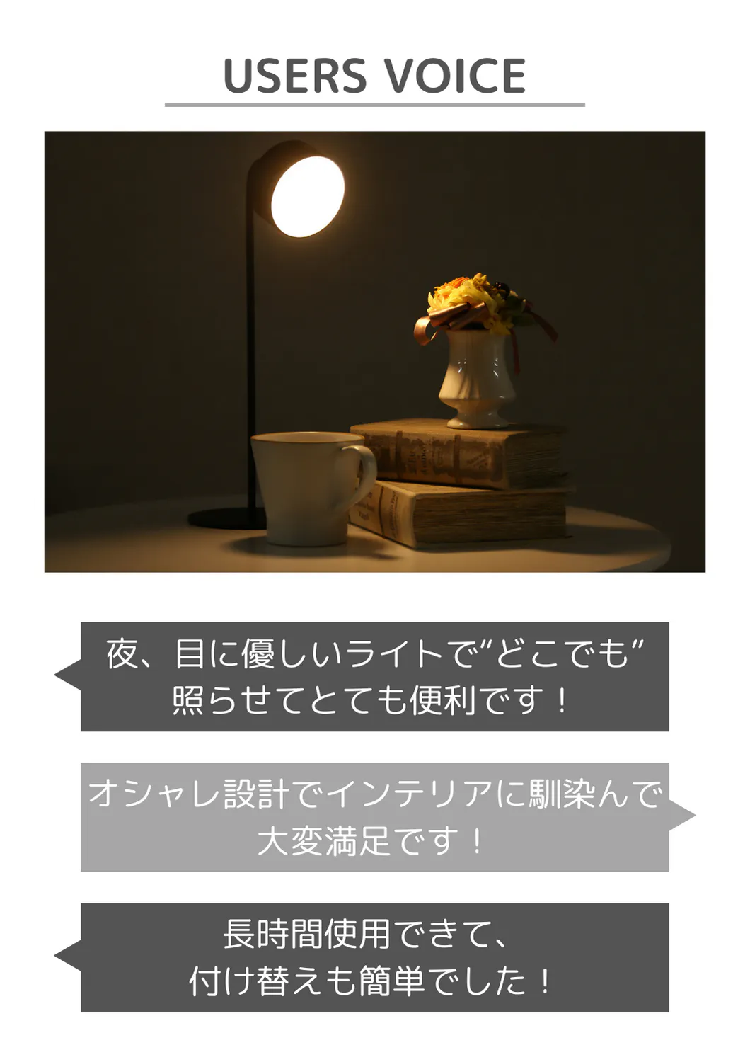 ◯目に優しい温暖色!嬉しい充電式で付け替えも簡単!