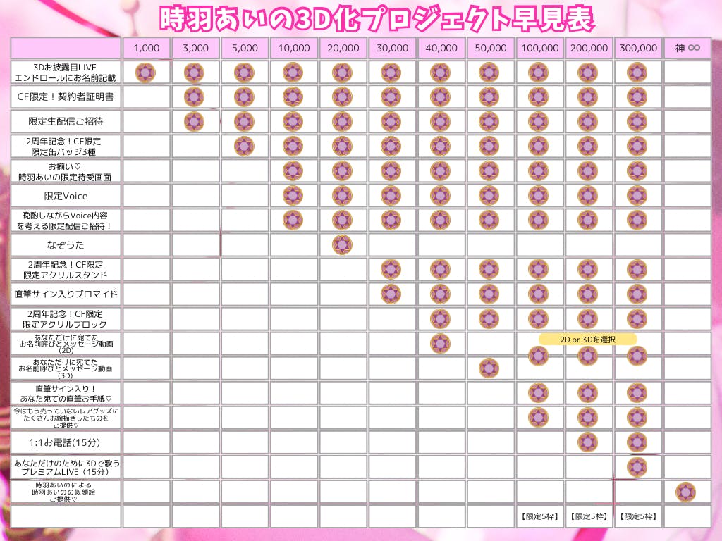 ◆3Dお披露目LIVEのエンドロールにお名前記載◆CF限定!契約者証明書◆限定生配信ご招待(※1)◆2周年記念!CF限定グッズ缶バッジ3種(44mm)◆お揃い♡時羽あいの待ち受け画面2種◆限定Voice(3分程度のもの/一律になります)◆【晩酌しながら契約者たちとvoiceの内容を決める】限定生配信ご招待!(※2)