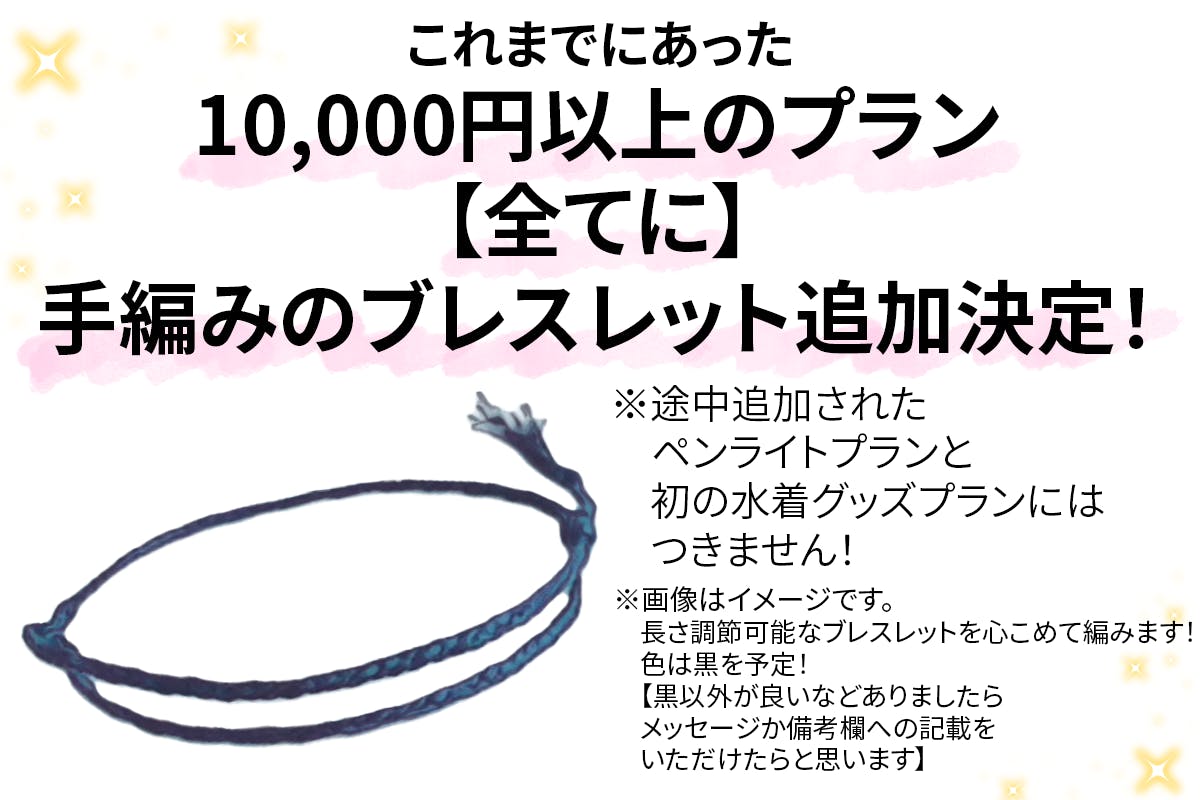 ※1と※2は別の限定生配信です。2つのどちらにもご招待いたします!(提供方法:どちらもメールにURLを記載します!)◆2周年記念!CF限定グッズ!特製アクリルスタンド(100×高さ130mm)◆直筆サイン入りブロマイド※書いて欲しいお名前を備考欄にご記載お願いします。◆2周年記念!CF限定グッズ!特製アクリルブロック!(横11×縦15.8cm)◆あなただけに宛てたお名前呼びとメッセージ動画※2Dか3Dのどちらにするかをご支援の際備考欄に記載お願いします。