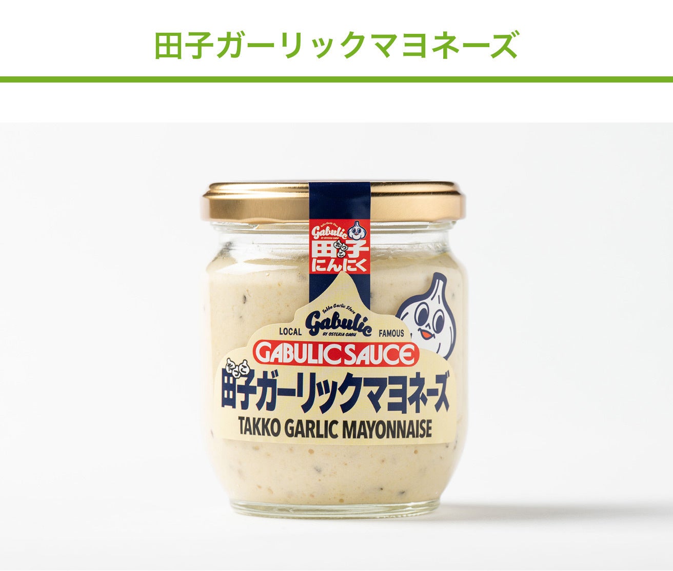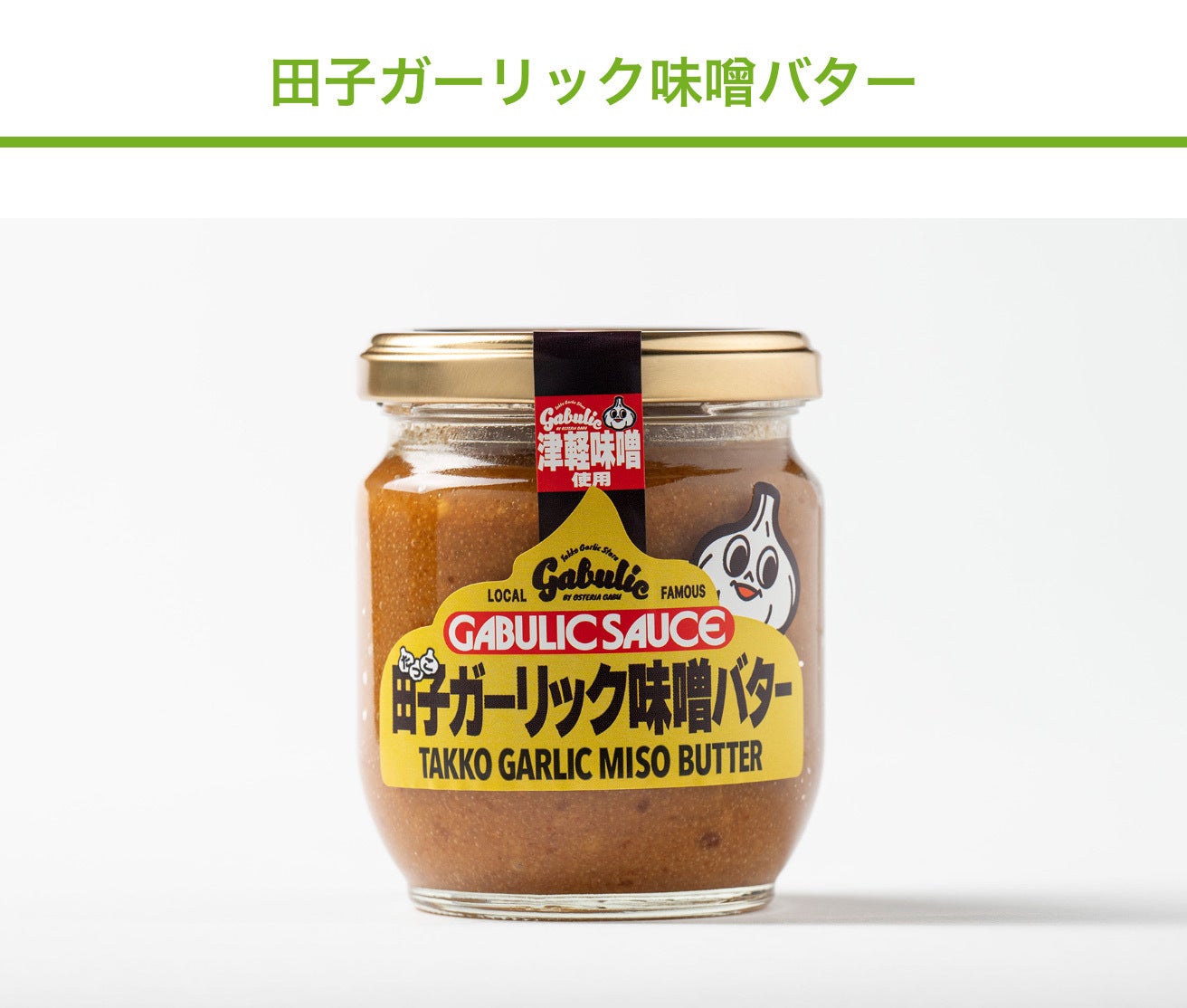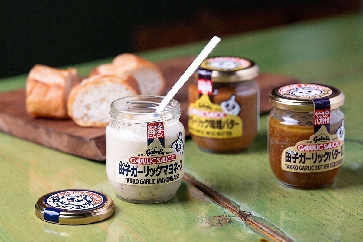 お店で超人気「GBSソース」を瓶詰にした「田子ガーリックバターソース しょうゆ風味」のほか、「田子ガーリックマヨネーズ」、「田子ガーリック味噌バター」の3種類をラインアップ。
