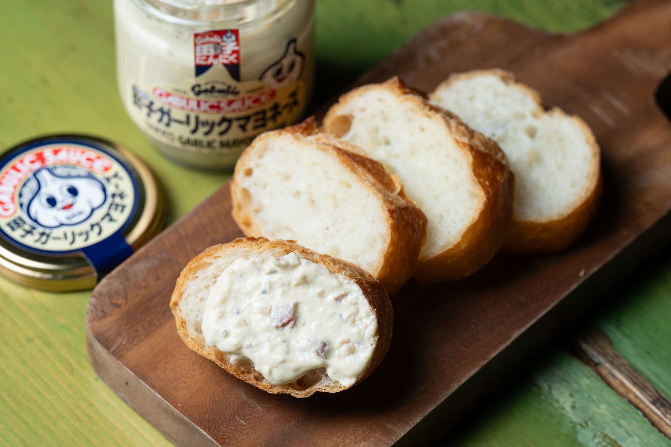 パンに合う「田子ガーリックマヨネーズ」は、田子にんにくをふんだんに使用し、刻みベーコン、玉ねぎ、チーズを特製のマヨネーズソースに混ぜ合わせ、アクセントに粗びきのブラックペッパーを使用。