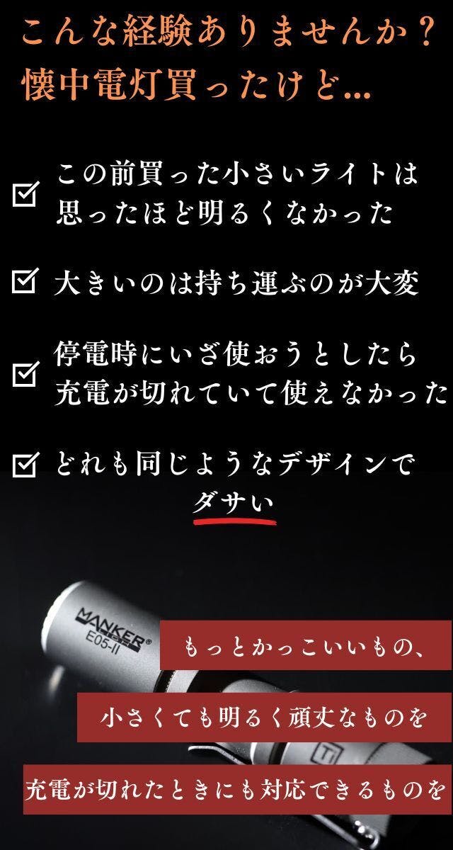 2024/08/22 11:00「E05ⅡTitanium」こだわりポイントについてご紹介(その12)✓ 片手で操作できるスイッチで便利懐中電灯のスイッチには、様々なタイプがあります。中には、両手で持って回して点灯、消灯を行うタイプもありますが、そういうのはちょっと面倒かもです。その点、テールスイッチやサイドスイッチタイプの懐中電灯は、片手で操作できるのが利点です。今回の「E05ⅡTitanium」はテールスイッチを採用!サイドスイッチタイプも結構便利です。あとは、好みになってくるかもしれませんね。それから、テールスイッチは外観よりもわずか低く設計されるため、誤った点灯を防ぐ設計。またテールスイッチは、サイドスイッチより誤点灯が少ないように思います。<懐中電灯の選び方>⇒ スイッチは、片手で操作できるかどうかをチェック! テールスイッチの懐中電灯を持ったことがないという方は、ぜひ1台持っておくといいかもしれません。 もっと見る