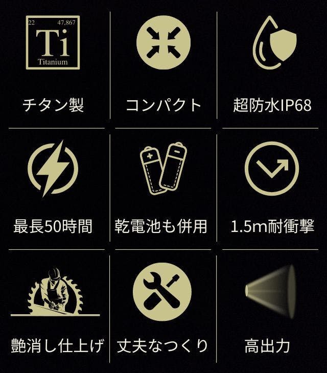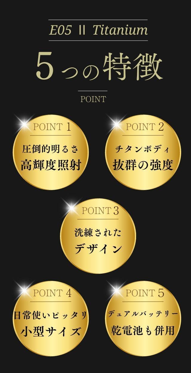 さらに内蔵バッテリーに加えて市販の乾電池、ニッケル水素電池も併用可能、1.5m落下テストをクリアし防水性能も優れた圧倒的なタフな作りの「E05ⅡTitanium」は、これまでのコンパクト系懐中電灯の常識をくつがえす一台とも言えるかもしれません。