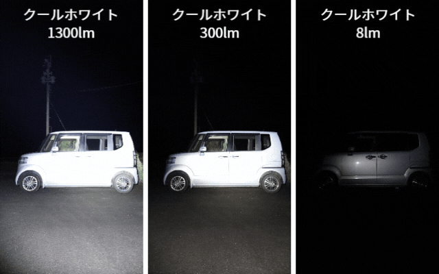 クールホワイトは、6500Kの高輝度で明るさ最大1300ルーメンの高出力なので、いろんなシーンで活躍。