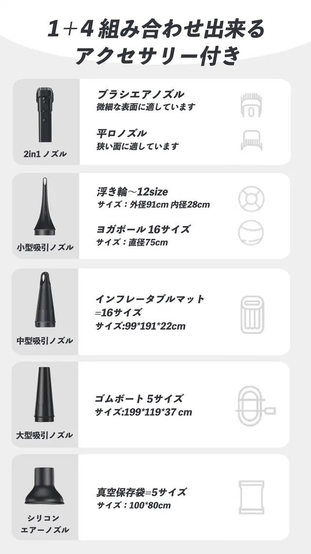 エアブロー機能や空気入れ、衣類の真空圧縮もできるので多機能に使える。
