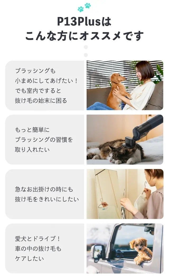 P13Plusはグルーミングブラシとハンディクリーナーの良いとこ取り。今まで困っていた抜け毛のお掃除を簡単にできるようにしました。