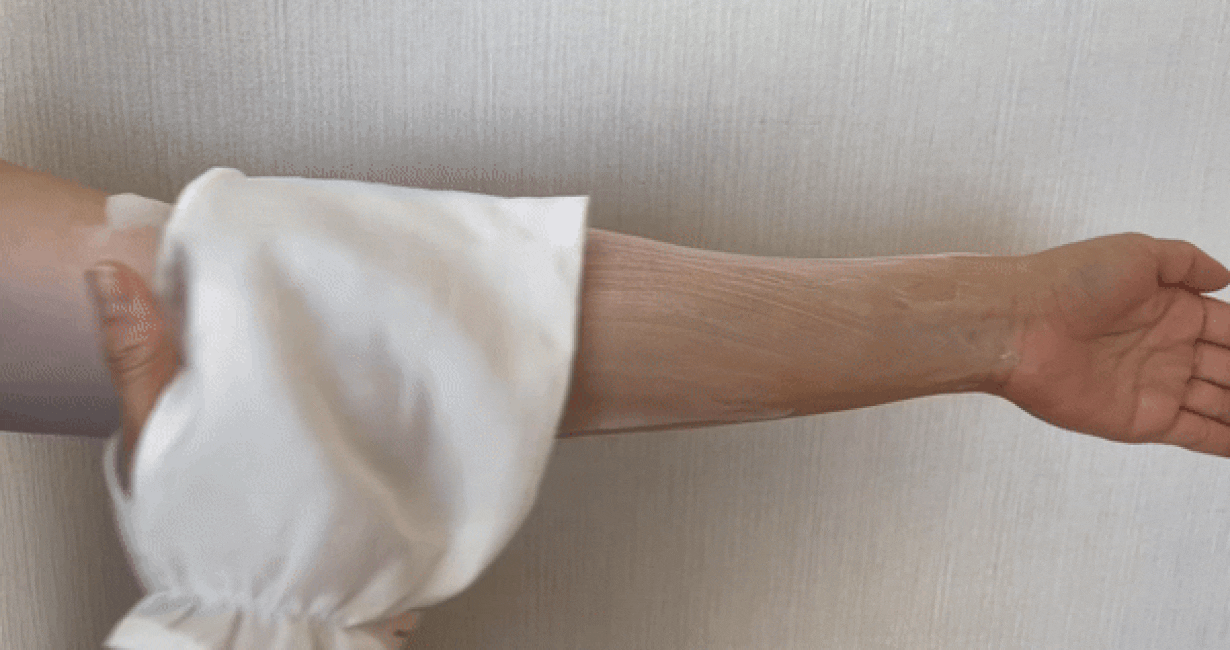 乾いた状態はまるでシルクのような手触りですが、水に濡れると生地に凹凸が生まれ、垢や角質汚れをからめ取ります。低刺激なのに、しっかり角質除去できる秘訣です。