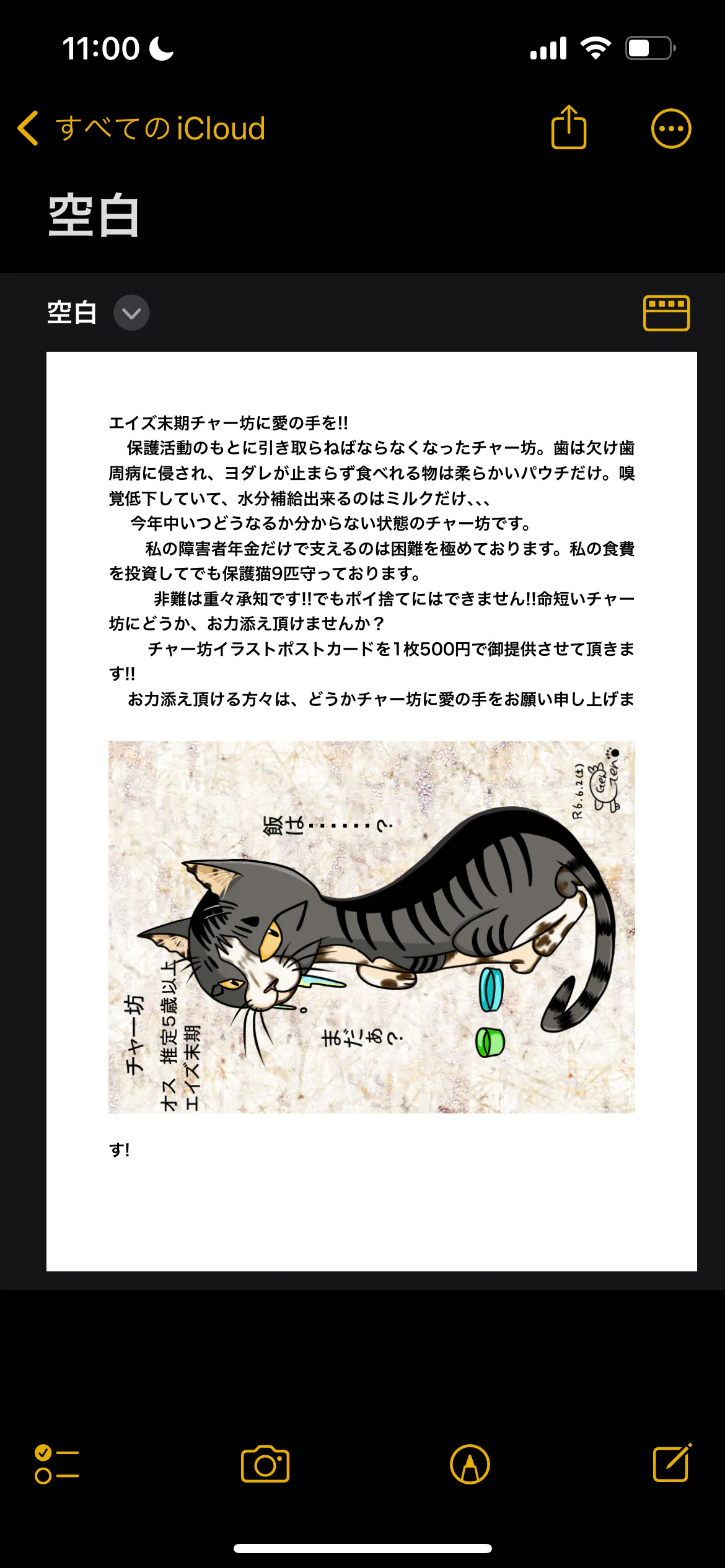 私はイラストを描きます。エイズ末期患者チャー坊のポストカードを、ご支援くださった方々に提供させて頂きます?掲載されている猫がチャー坊です。