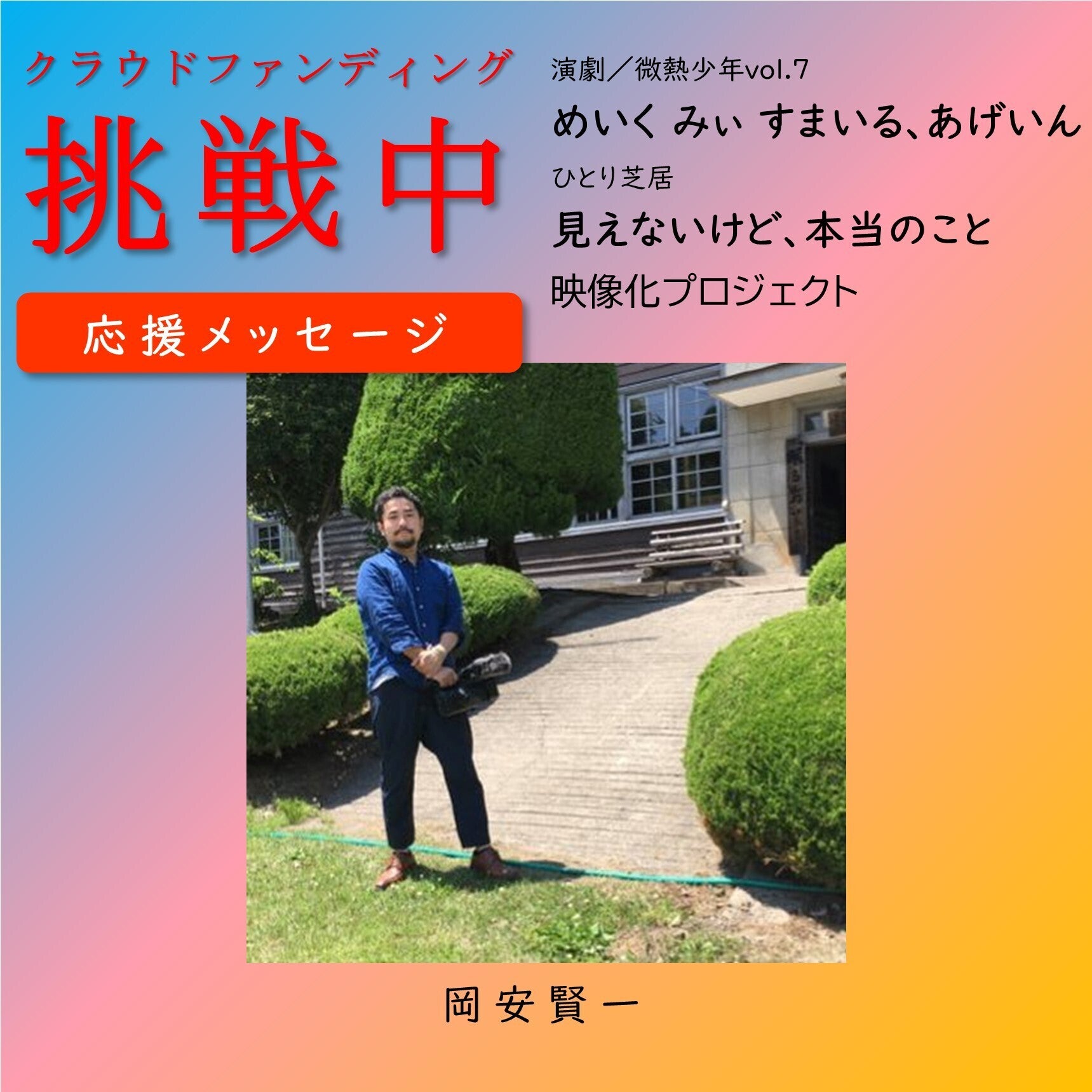 第八弾は演劇/微熱少年の新作公演すべてを映像化してきたビデオグラファー/岡安賢一さん。まさにこの映像化プロジェクトの要となる方からメッセージをいただきました。演劇は映像で残せるのか?加藤真史さんは年代で言えば先輩にあたりますが、群馬で本気で演劇を作ってきた人間として、一方の僕は群馬で本気で映像を作ってきた人間として、いつも対等に創作を続けてきました。演劇が、生のもの、一回限りのもの、観劇するその日の役者スタッフのみではなく、観客それぞれの体調や気持ちによっても印象が変わる<体験>だとすれば、映像にはその多くのものがこぼれ落ちてしまいます。映像の特徴として、役者の表情にカメラが寄れる、カットとカットの繋ぎによって映像としてのドラマが生まれる等はありますが、それは下手をすると全てを崩してしまう可能性がある行為でもあります。が、僕(やその撮り方を全て委ねてくれる加藤さん)が目指してきたものは、<映像として再構築した時に、観劇体験を追体験できる映像、そして観劇では得られない魅力のある何かを含ませること>でした。今回で言えば、両演劇とも<不在>を描く劇ともいえる中で、カメラを向けても映らない不在や特別な視線を映像に残せないかと思い、編集を続けています。一人でも多くの方にこの映像を体験していただきたいです。岡安賢一さん岡安さんには素晴らしい予告編ダイジェスト映像も作成していただきました。是非、ご覧頂き、お知り合いにもご紹介いただけると嬉しいです。https://youtu.be/3Jsv2nQGXM4【岡安賢一】ビデオグラファー/岡安映像デザイン。群馬県中之条町生まれ、在住。日本映画学校(現日本映画大学)にて安岡卓治氏、原一男氏よりドキュメンタリー制作を学ぶ。山形国際ドキュメンタリー映画祭2003事務局スタッフ。現在は地元群馬で映像制作を行う。国際芸術祭中之条ビエンナーレでは、オープニング映像制作や全アート作品・全イベントの映像によるアーカイブを担当。ほか、アーツ前橋、太田市美術館・図書館、原美術館ARCの映像制作に関わる。現在、目が見えない彫刻家・三輪途道氏のドキュメンタリーを制作中。全国から映画シナリオを公募し映画化させる取り組みを行う「伊参スタジオ映画祭」実行委員長。