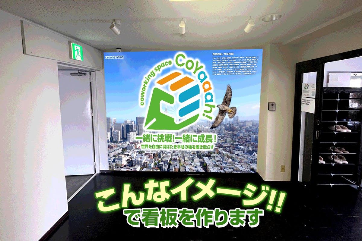 また支援していただいた方の名前を入れてCoYaaah!の入口に看板(ターポリン)の設置を予定してますので、その費用に使います。
