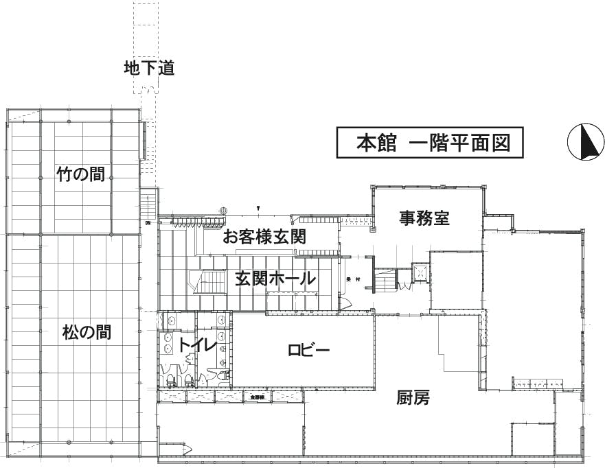 玄関を入ると右手中央に圧倒されんばかりの大階段が鎮座し、二階大広間へと導いています。この階段の奥を廻っていくと右手に昭和初期からの座敷「竹の間」と当初の広間と呼ばれた「松の間」あり百年の歴史の佇まいとそこから眺められる庭園は、お客様を非日常的な異次元の世界へと導いてくれます。