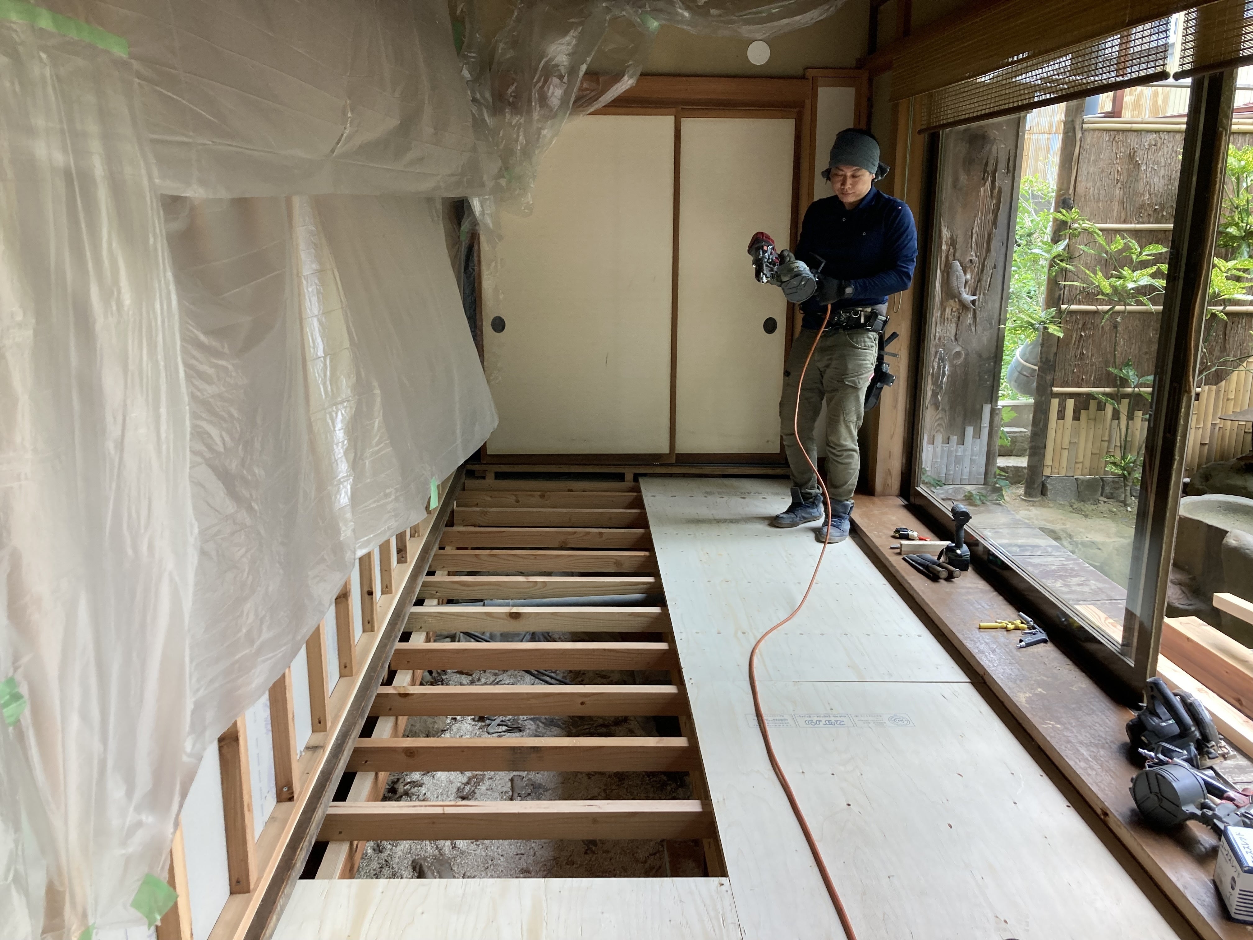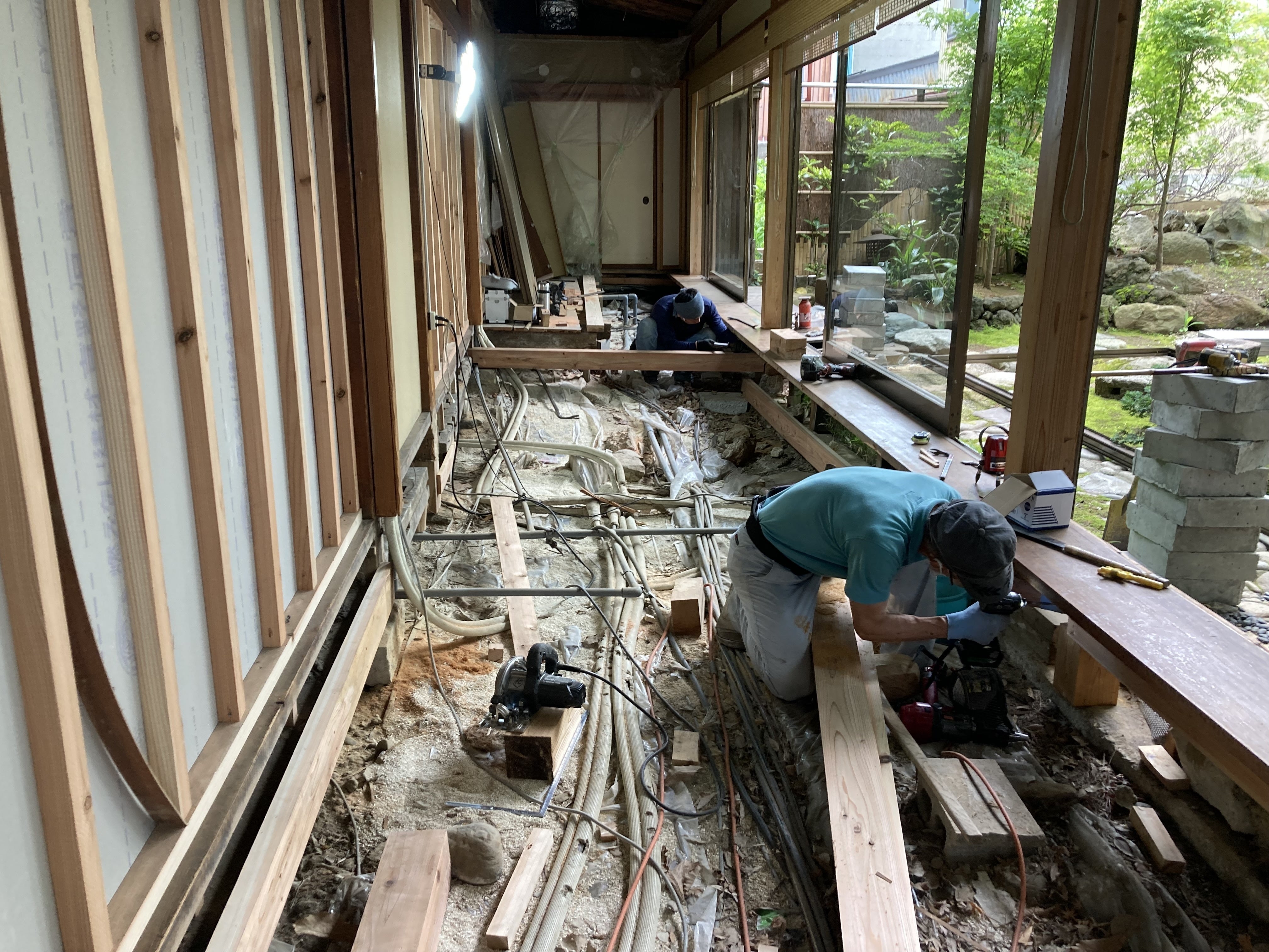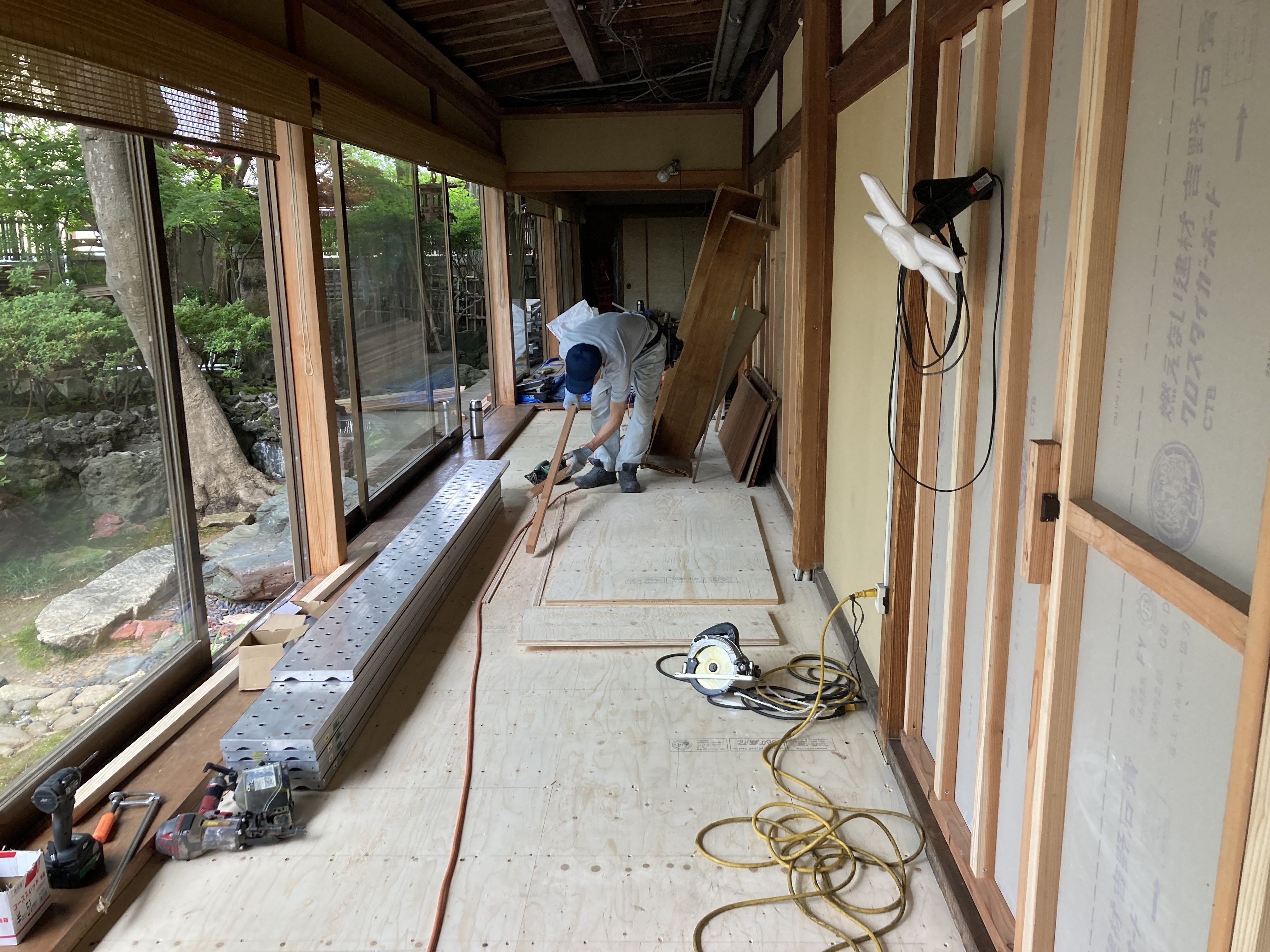床も貼り終え、この後は窓枠の入れ替え工事に入ります。資材調達に多少時間がかかりましたが順調に進んでおります。