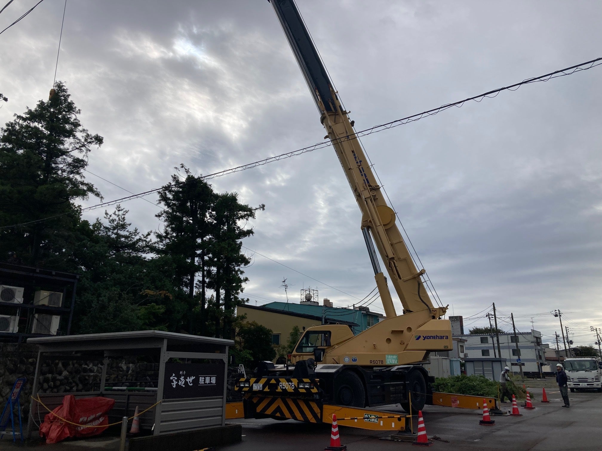 まずは庭の木の伐採から進めてますが、大きなクレーンで伐採した木を釣り上げております。
