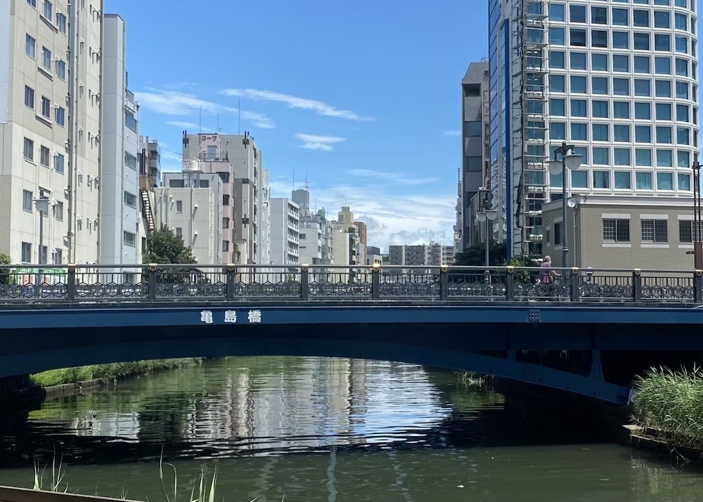 亀島川にかかる亀島橋を当店のテラスから眺める.右手ビルの奥にギリギリ、スカイツリーが見える.