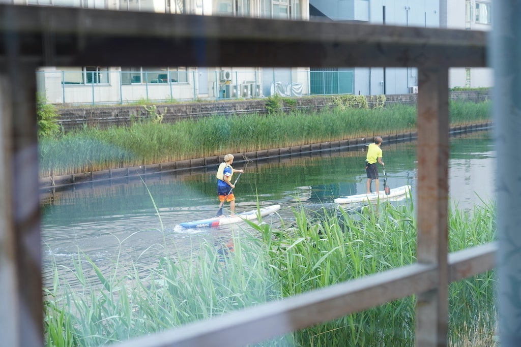 亀島川でSapの練習に励む大学生.コロナがはじまった頃からおなじみになった朝の風景.