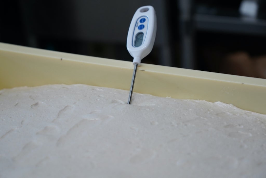 発酵をチェックする.酵母はその日そのときの温湿度に大きく影響を受けるため、温度管理は欠かせない.できるだけ伝統的な工法で回りの環境と共存しながらのパン作りにこだわっている.