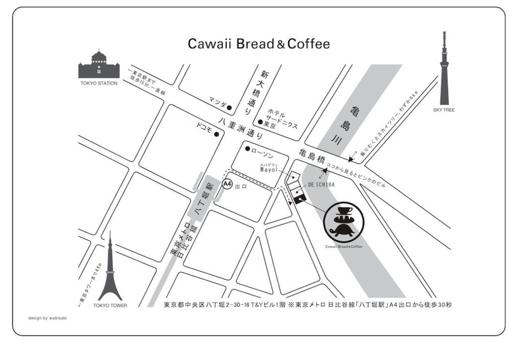 東京駅八重洲口から歩いて15分.カワイイブレッド&コーヒーは亀島川の曲がり角に位置している.
