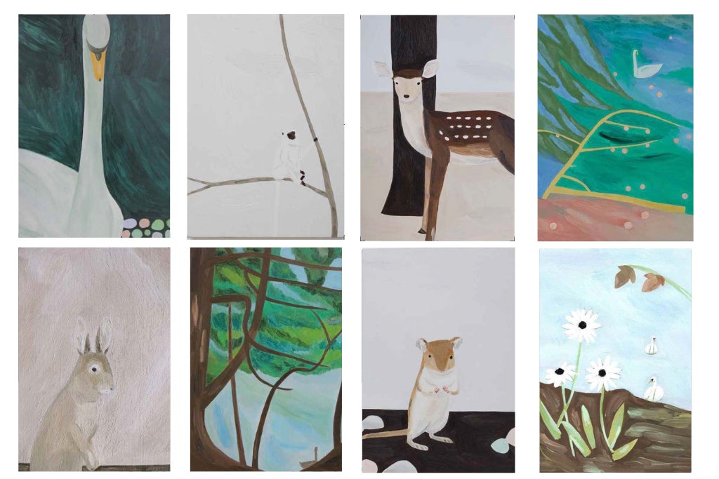 彼女は古いポストカードや観光パンフレットの写真をモチーフにした風景や動物を描きます。そぎ落とされた構成と繊細な色づかいが特徴的な絵画作品は、PolarisのCDジャケットやコンサート広告でも作品が使用されたことがあり、目にされたことがある方もいらっしゃるでしょう。