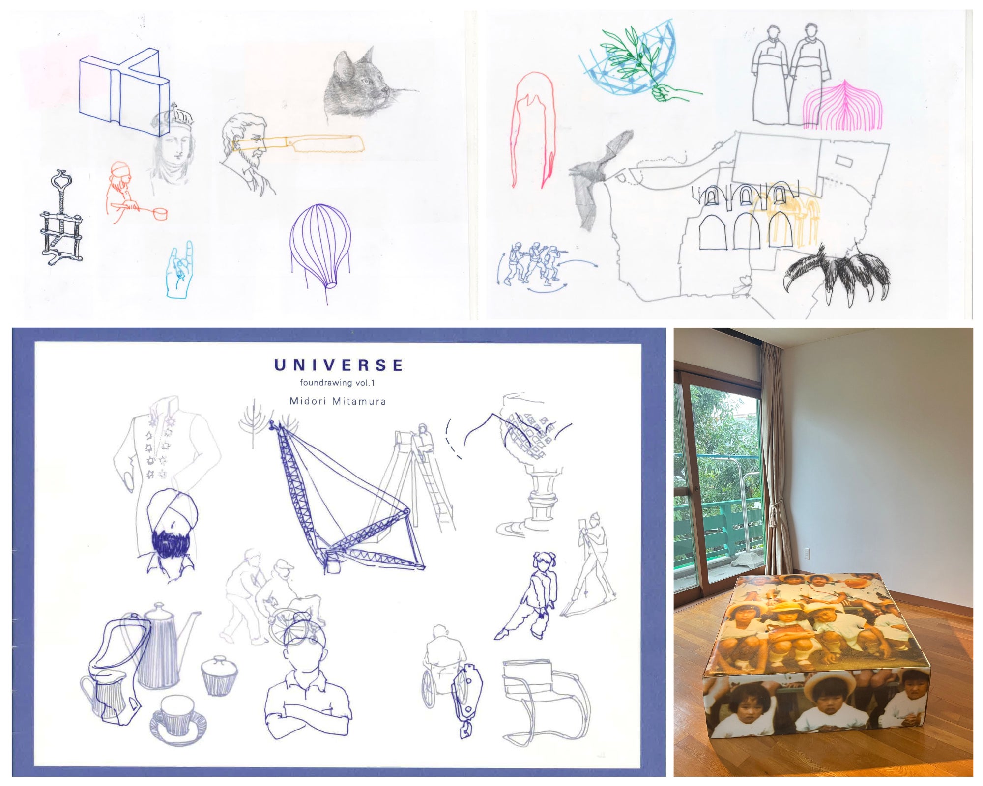 上はファウンドローイング2点。ファウンドローイングとは、トレーシングペーパーにトレースした線画のこと。上左/《猫の告げ口》 上右/《異国の果実》。 下左はドローイング集『UNIVERSE foundrawing vol.1 』の表紙。下右は2023年に東京・国立のZEIT-FOTO Kunitachiでの個展「奏でる家にて、昨日が手を振る」での展示