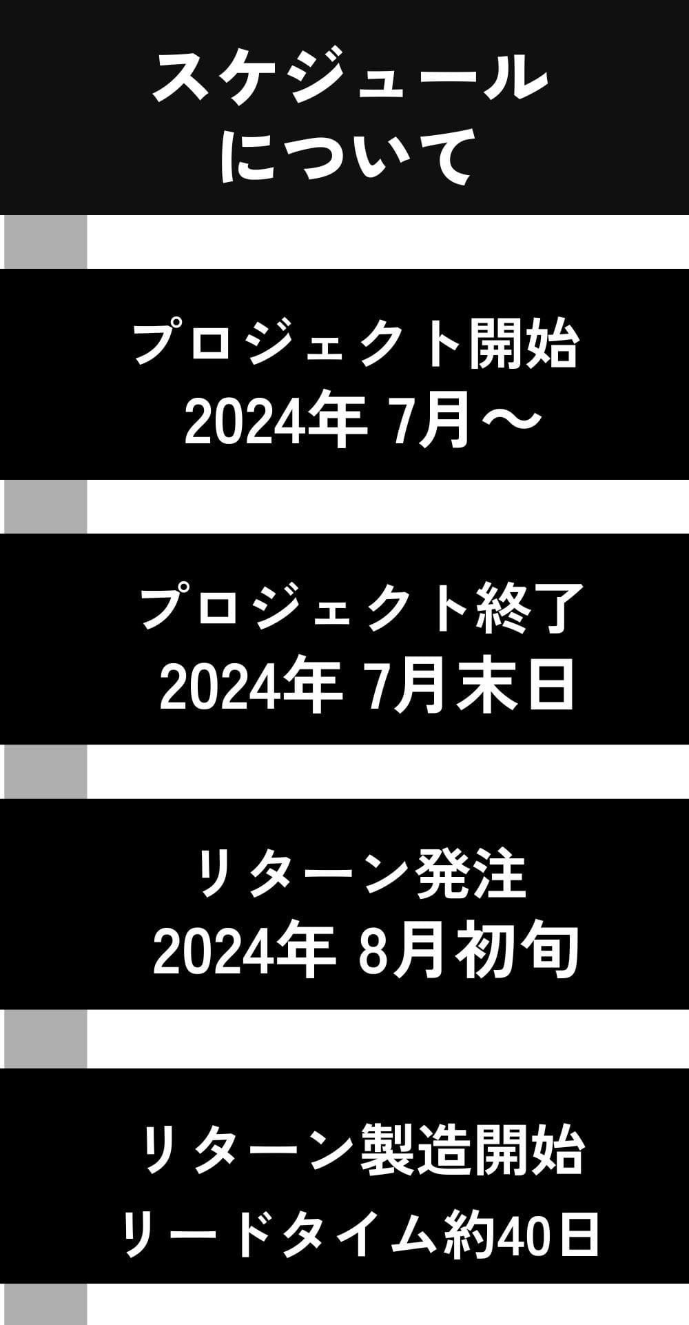 ●引渡し時期: 各リターン詳細に記載の発送予定⽉を引き渡し時期とします。但し、開発・⽣産状況によって遅れが⽣じる場 合がありますのでその際は当プロジェクトページ内の「活動報告」または購⼊者へのメール等で連絡します。
