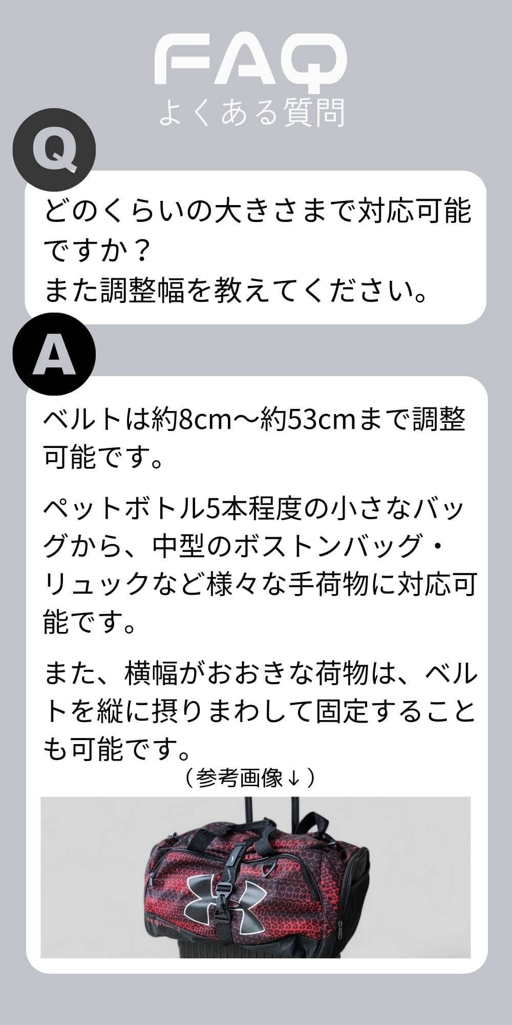 2024/07/24 06:59皆さまお世話になります。サポータ様から、キャリバーが、スーツケース幅の「幅広タイプ」にも利用できますか?というご質問を頂きましたので、こちらにも共有させていただきます!スーツケースケースのキャリバーの幅は約23cmまで対応可能です。ベルト通し口の片方は、伸縮性のあるゴム素材となっておりますが、 添付写真のタイプのように、スーツケース幅に沿うような幅広のキャリバーには、取り付けできないため、購入前にご確認をよろしくお願いいたします。 もっと見る