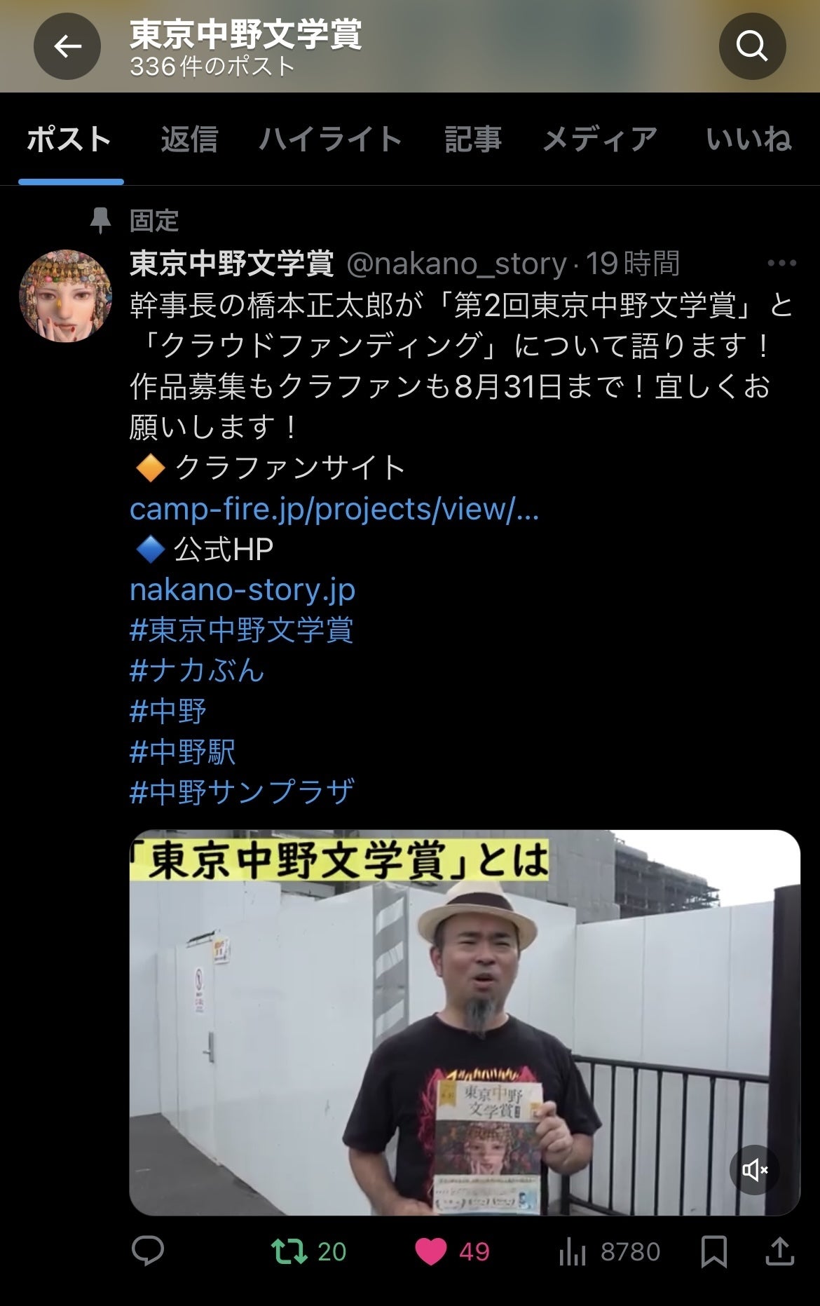 「第2回東京中野文学賞」「ナカぶん」クラファン、最後のお願いです!出来ましたら、支援&お友達にオススメシェアのほど、宜しくお願いします!「第2回東京中野文学賞」クラウドファンディングも8月31日23:59:59までとなり、あと16時間、となりました!約1ヶ月…!送ったメッセージは2000通以上!中野区延べ300箇所にポスターを掲示!動画も作った!投稿もしまくり、オーケンにもリポストしてもらった!もっと色々出来たかも…いや、今回はここまでが限界だったか…ぬあああッッ!最後に時間までの大拡散を皆様に託します!!!クラファンサイトhttps://camp-fire.jp/projects/769640/view?utm_campaign=cp_po_share_c_msg_mypage_projects_showHPhttps://nakano-story.jp/今現在、支援総額71万500円を支援者数114人の方から頂き、実行委員もラストスパートに燃えております!ギリギリで凄い伸びてます!2日で約20万、支援者は30人増!クラファン賞投票権にも計84人の支援をして頂いております!ここまで多くの方に支援して頂いたら、このテンションのまま出来るだけ増やしたい!総額100万へ!と思っておりますので、ぜひ滑り込みのご支援と、支援された方もお知り合いへの情報シェアー「クラファン賞」参加してみない?の様なオススメーのほど宜しくお願い致します!また、リターンは、★クラファン賞投票権の他に、★お礼メール★公式ホームページへのお名前掲載★最終選考委員も参加予定の授賞式イベント・シンポジウム参加権★ナカぶんサポーター証(データ送付)★ナカぶんポスター・チラシ・中野区観光協会発行物(中野つけ麺MAPなど)(授賞式当日手渡し)と色々あります!大事なのは金額より、この東京中野文学賞にクラファンで多くの方に参加してもらうことだと思っております!支援された方は、幹事長・橋本が分かるだけでも、中野だけではなく日本全国・世界各国の方々であり、経営者・会社員・マンガ原作者・編集者・映画監督・映像クリエイター・舞踏家・ダンサー・DJ・弁護士・ミュージシャン・デザイナー・画家・IT・まちづくりやまちおこしに関わる方・武道家・子育て事業に関わる方・ネイリスト・飲食関係・オーケンファン等々、様々な方がご支援頂いております。この多様な方の支援が、「第2回東京中野文学賞」と「中野」への期待の大きさだと思っておりますので、実行委員会一同、身の引き締まる思いです。既に170を超える力作が応募されており、前回と同じく〆切に向けて爆発的に応募が増えると考えられます。8月31日で作品募集は終わり、一次選考・二次選考とともに、実行委員は協賛集め・助成金申請・授賞式イベント準備などに取り掛かります。しつこい、もう見たくない!という声も聞こえてきそうですがw、幹事長・橋本の「ナカぶんは中野区の書店さん含め中野全体が応援してくれているぞ」「出版された本もあるんだぞ」編と、解体前の中野サンプラザを背に「再開発・中野を日本のカンヌに!?・クラファンへの本当の想いを酷暑の中語るぞ」編を足したフルサイズ4分超動画をどうぞ!https://youtu.be/4CzQD7l0fqc?si=Z-oAXBgttaXbPcCC支援を迷っておられる方、忘れてた方、ギリギリに運良く見てしまった方、「第2回東京中野文学賞」のこれからの発展に、飲み代を我慢してw、ご支援・ご参加のほど宜しくお願い致します!!!——————————————————■後援:東京都、中野区、東京商工会議所中野支部、中野区商店街連合会、中野工業産業協会、東京中野ライオンズクラブ、東京都書店商業組合、NPO法人中野コンテンツネットワーク協会、中野経済新聞————————————————————————————————————■最終選考委員:中島京子(小説家) 篠原哲雄(映画監督) 鬼塚忠(小説家・作家のエージェント) 大槻ケンヂ(ロックミュージシャン)——————————————————