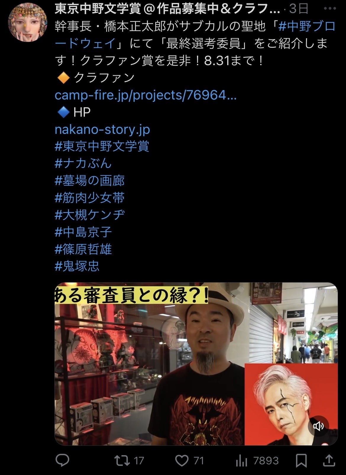 幹事長・橋本正太郎がサブカルの聖地「#中野ブロードウェイ」にて「墓場の画廊」と「最終選考委員」を紹介する動画です!↓